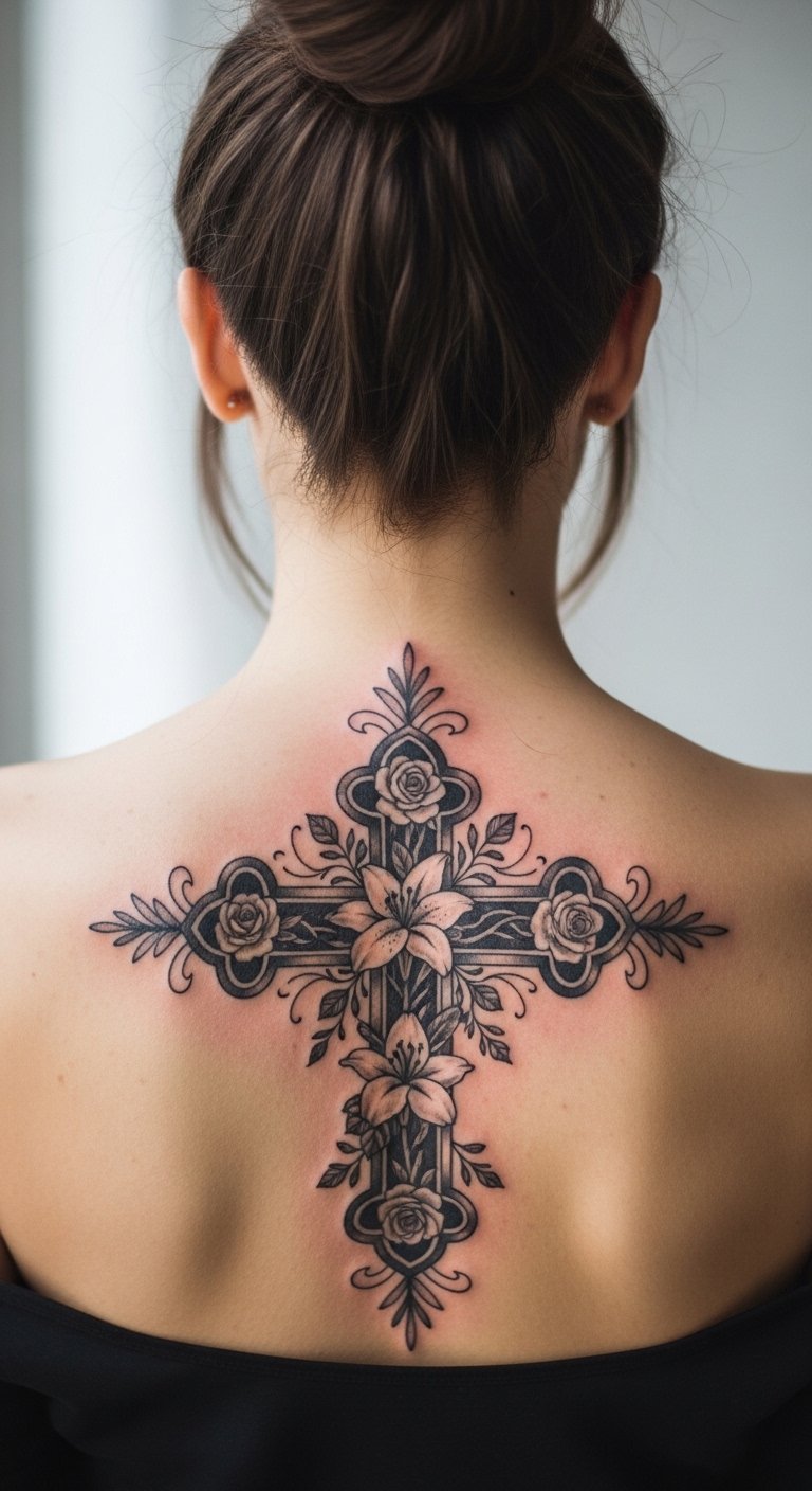 A back cross with flowers creates a bold statement. It’s for women who want to blend spirit and beauty. Opt for roses around the cross for love. This large design needs more space but looks stunning. Pain varies, so prepare with numbing cream. Save by choosing smaller studios, about $100. DIY by sketching on paper and adjusting. Use body paint to test first. Moisturize daily for best results. This tattoo inspires confidence. Add colors for vibrancy. It’s a powerful way to celebrate life.