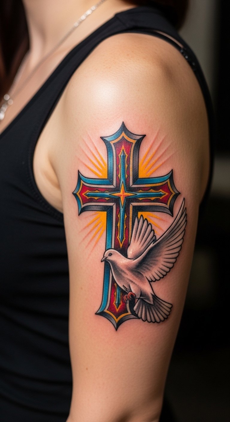 A colored cross with doves brings warmth and peace. It’s ideal for vibrant expressions. Pick soft hues like blue for the birds. This design pops on visible spots. Healing might take extra care. Look for sales at shops, starting at $90. DIY by coloring sketches at home. Use washable paints to experiment. Protect it from sun initially. This tattoo symbolizes hope. Mix in personal colors for fun.