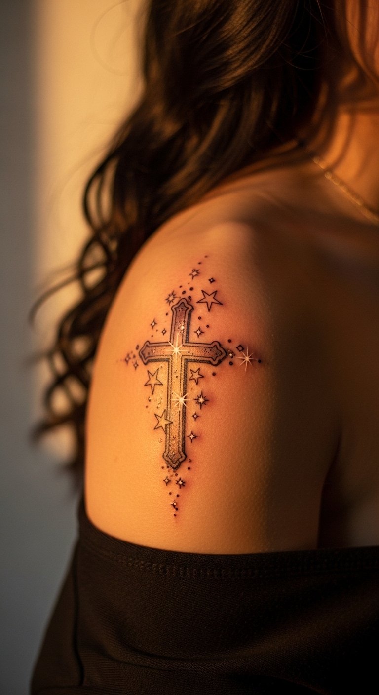 A star-accented cross lights up your story. It’s for dreamers and believers. Add stars for guidance. This design shines on the back. It requires sun protection. Find deals at $70. DIY with star sketches. Practice on paper. Care for it daily. This tattoo guides you forward.