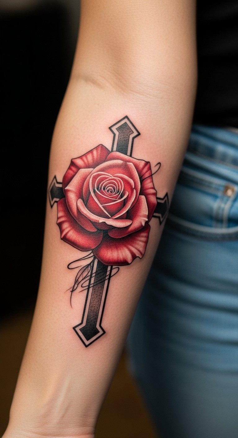 A strength rose cross represents resilience. It’s for strong women. Add roses for beauty. This design is versatile. It needs regular care. Look for $60 options. DIY by rose sketches. Use markers first. Moisturize well. This tattoo builds confidence.
