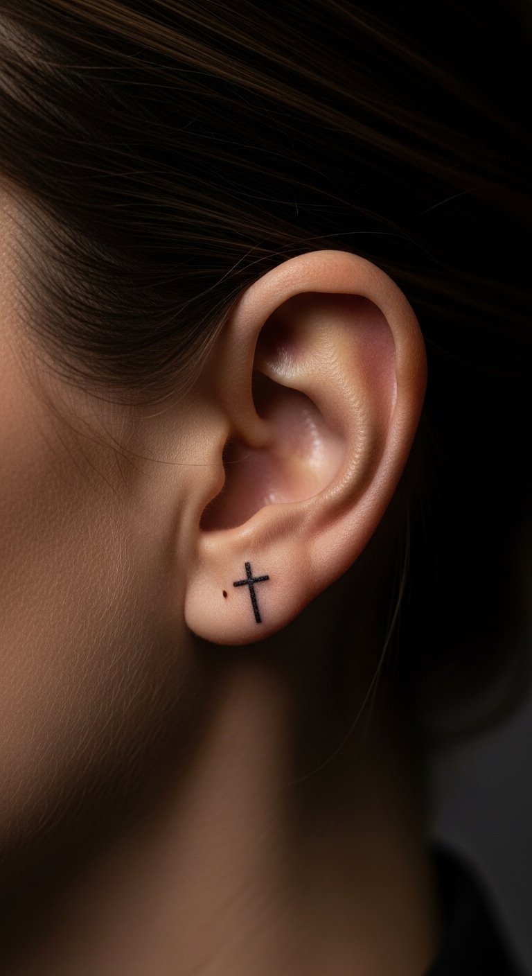 A behind-the-ear cross tattoo adds a secret touch. It’s great for private expressions of faith. Choose a tiny version with clean edges. This placement stays out of sight under hair. Healing takes about two weeks with care. Look for budget options at walk-in shops, around $50. DIY ideas include using stickers to preview. Draw with a fine-tip pen on your neck. Keep it moisturized afterward. This tattoo feels intimate and strong. Combine it with stars for more depth. It’s a subtle nod to your path.