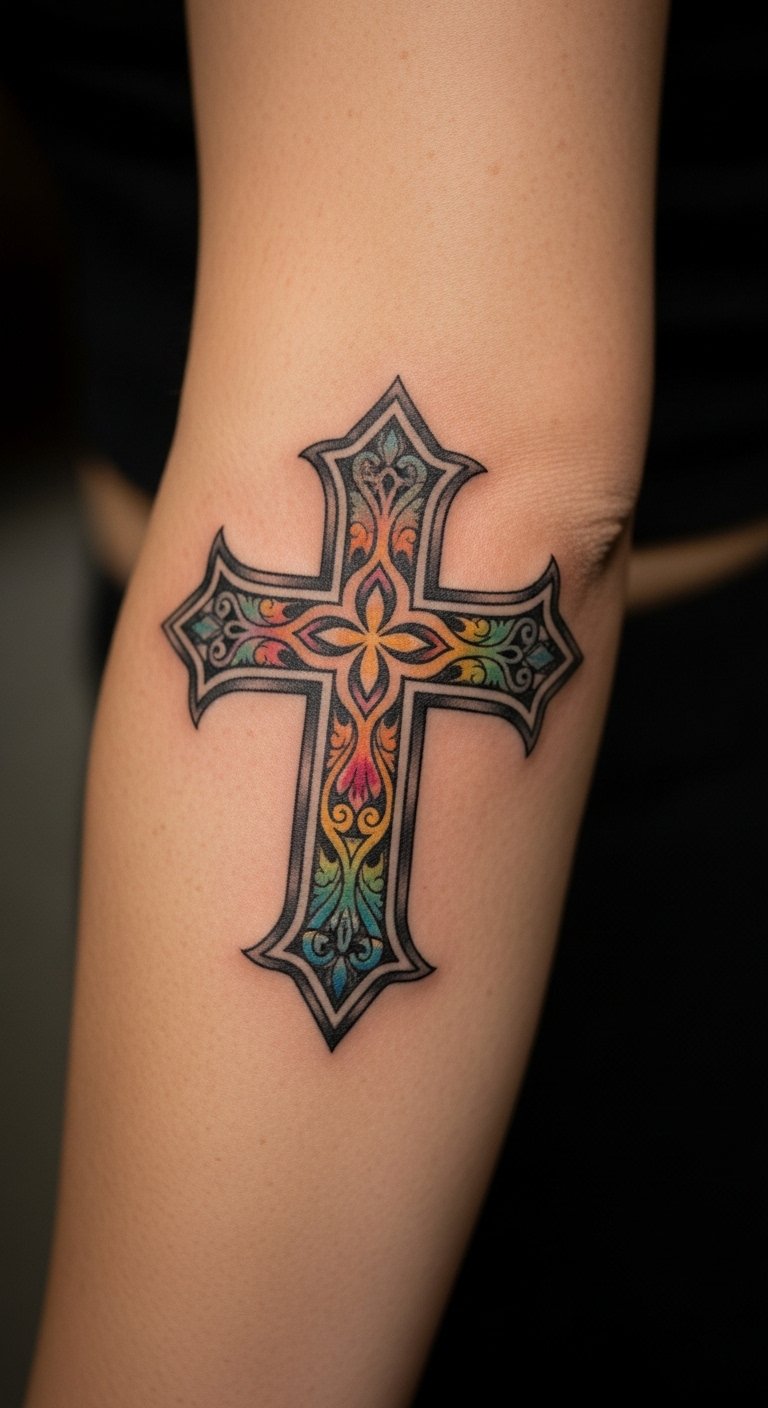 A cultural blend cross honors diversity. It’s unique and respectful. Mix in patterns from your background. This style is adaptable. It needs thoughtful design. Find it at $70. DIY with cultural research. Sketch fusions. Care for it gently. This tattoo celebrates heritage.