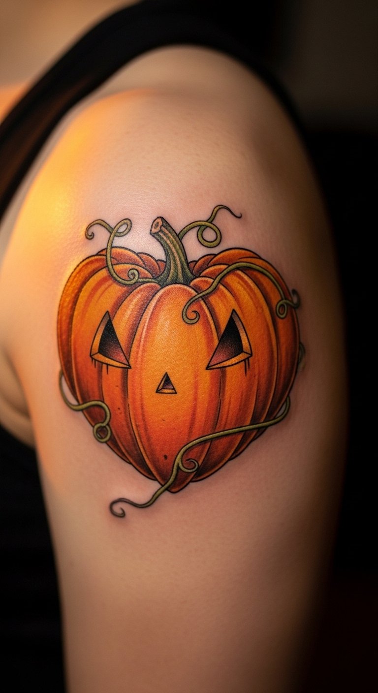 Picture a heart-shaped pumpkin tattoo that blends love and Halloween in one spot. This design features a plump pumpkin formed like a heart, with friendly eyes and a grin. Start small on your wrist for a budget option. Use temporary tattoo kits from the dollar store to test it out first. They cost less than $5 and last a week. Draw your own version at home with washable markers, adding simple lines for the eyes. Keep colors bright with food-safe dyes if you’re DIYing. This tattoo adds a sweet touch to any outfit. Go for black ink to keep costs down at a local shop. Pair it with accessories like themed jewelry for extra flair. Simple tweaks make it personal without extra fees.