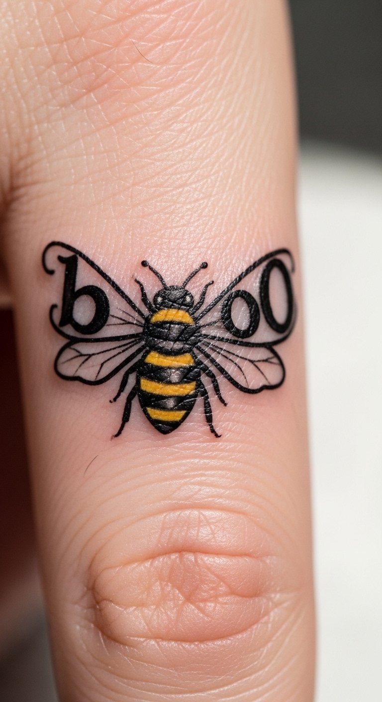 This boo-bee tattoo turns a bee into a Halloween star with “boo” on its wings. It has stripes and big eyes for laughs. Put it on your finger for quick flair. Grab bee stickers from craft stores for $2 to try. Draw a simple bee at home with markers, adding spooky eyes easily. Use craft glue for a temporary stick that peels off fast. Keep it tiny to save on ink costs. This one pairs with costumes or alone. Change the wings with doodles for your twist. Budget tips include free apps for digital designs before committing.