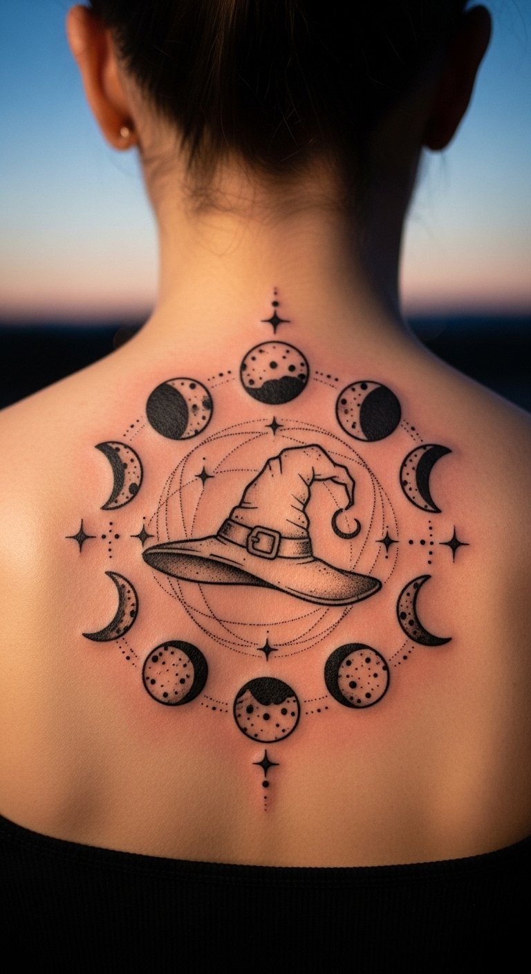 A witch hat with moon phases makes a magical tattoo. The hat sits with crescent moons around it, all in cute lines. Spot it on your back for a big statement. Use moon decals from online shops for $5 tests. Sketch phases on paper at home, then apply with safe body paint. It costs little and fades quick. Add stars with dot stickers for extra pop. This design works for night events or daily life. Go small to lower tattoo prices. Personalize with your birth moon for fun. Simple tools make DIY easy and cheap.