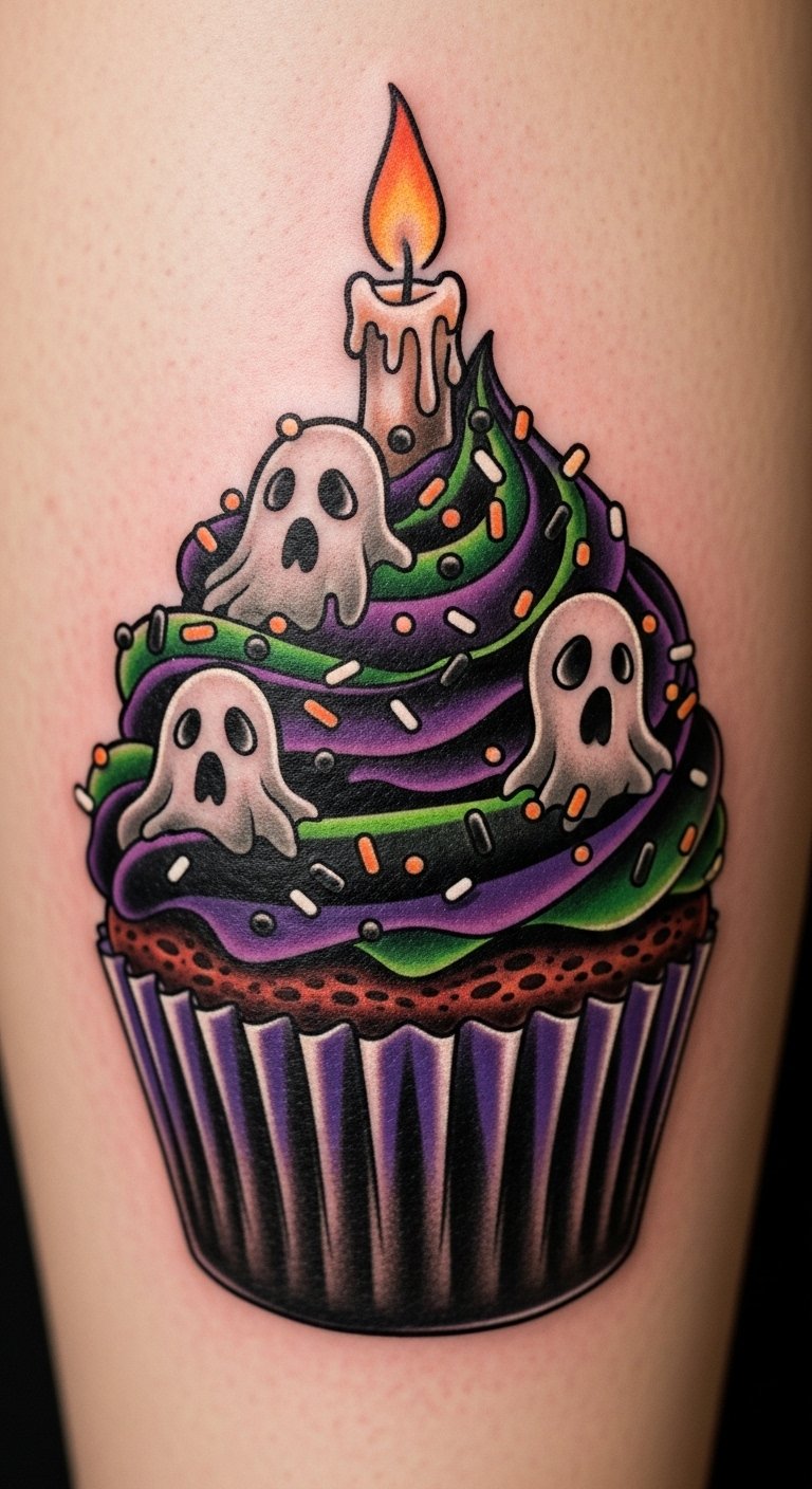 A Halloween cupcake tattoo features frosting with ghost shapes. It’s sweet and eerie together. Place it on your leg for fun peeks. Use cupcake stickers from party sections for $3 trials. Draw a cupcake with markers, adding spooky tops easily. Edible markers from the kitchen let you test on food first. Keep details basic to stay budget-friendly. This design spices up meals or outfits. Opt for flat colors to cut costs. Customize with your flavor ideas. Quick drawings make planning simple.
