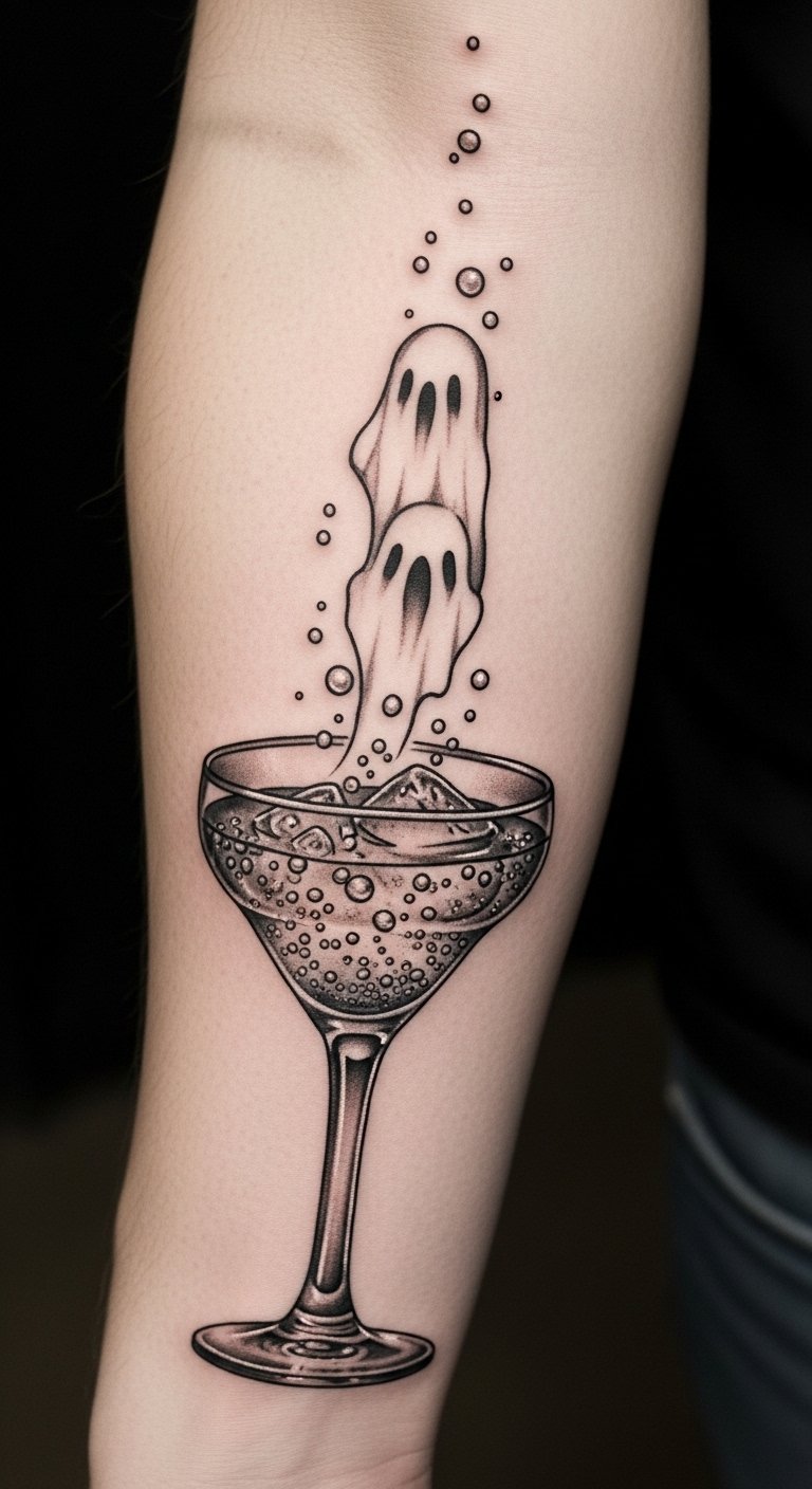 This spooky cocktail glass has bubbles like ghosts inside. It’s a party in ink. Spot it on your forearm for social flair. Try glass stickers from online for $4. Sketch a glass with markers, filling with bubbles fast. Use drink coasters as stencils for DIY. Keep it basic for low costs. The design fits gatherings perfectly. Choose clear lines for budget sessions. Add your drink type in sketches. Easy tweaks make it yours.