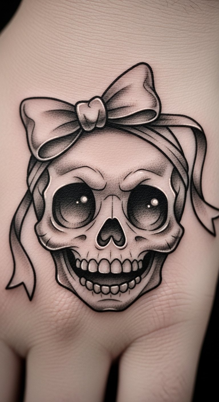This cute skull wears a bow for a girly twist. The skull has a grin and tied ribbon. Put it on your hand for constant view. Find skull decals at toy shops for cheap. Draw one with markers, adding the bow fast. Ribbon scraps help for temporary designs. Stay simple to cut costs. The tattoo brightens moods daily. Choose small sizes for deals. Customize bows in sketches. It’s fun and easy.