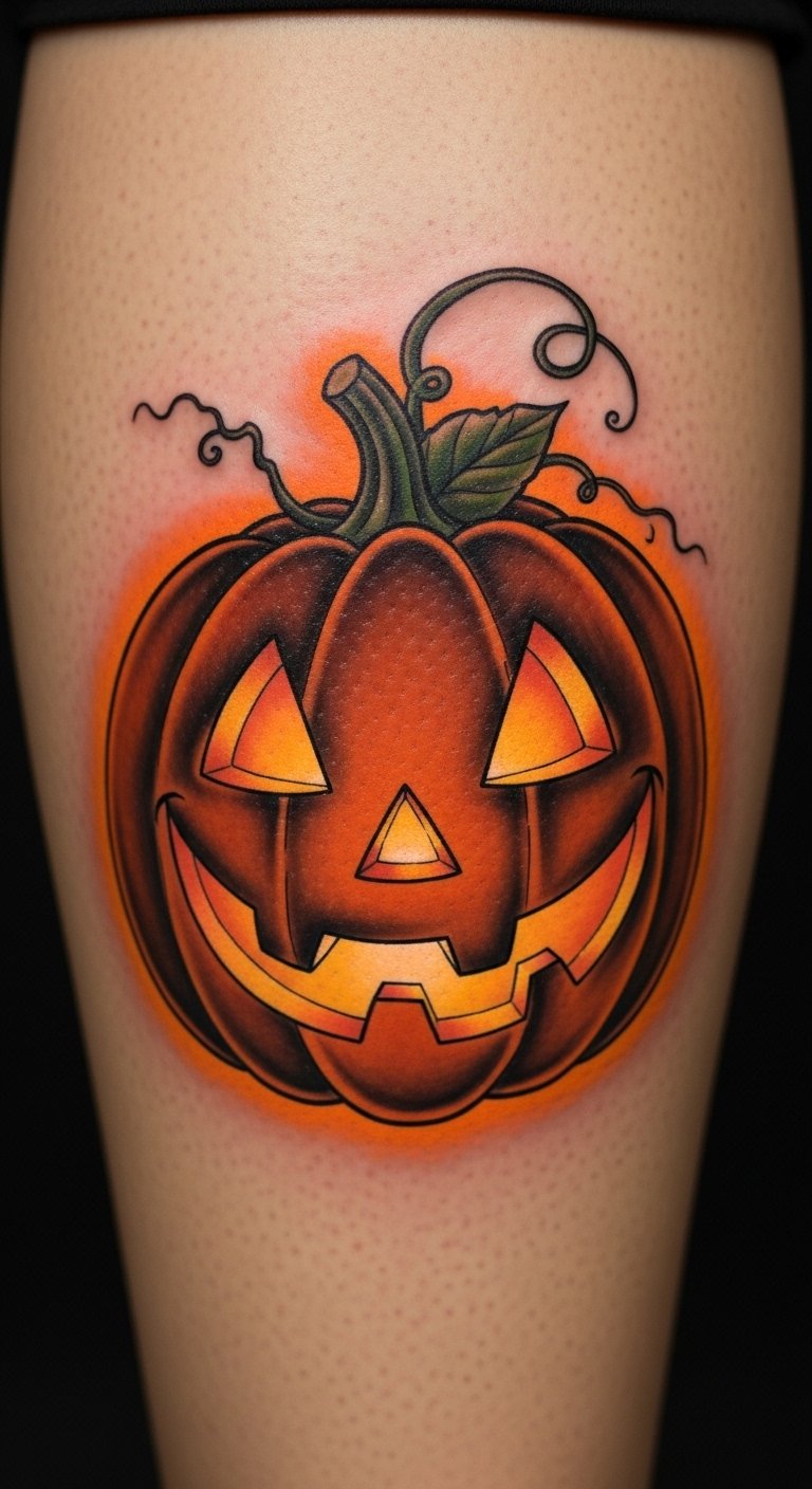 A jack-o’-lantern face brings carved smiles to life. It’s all eyes and teeth in ink. Wear it on your calf for movement. Use pumpkin stencils from fall decor for $1. Sketch the face with orange markers, lighting it up. Carve a real pumpkin first for ideas. This is free fun. The design screams October joy. Go for basic shapes to save. Add personal carvings in art. Simple steps make it doable.