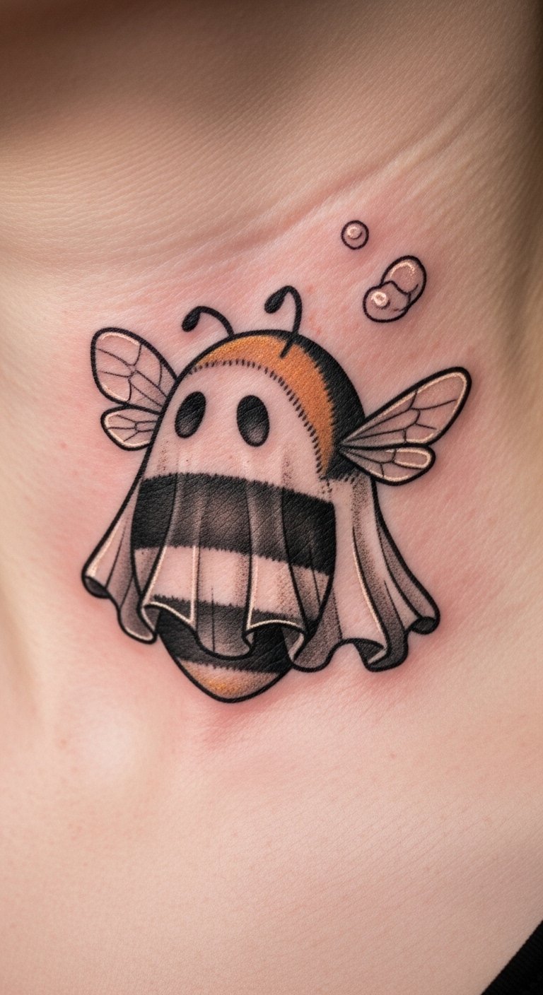 Ghost bumblebee combines float and stripes for whimsy. It hovers with bee features. Spot it on your neck for quick notice. Try bee-ghost hybrids from online prints for low cost. Draw one with yellow markers, ghosting the body. Insect toys inspire shapes at home. No extras needed. This tattoo flies in creativity. Keep stripes straight for budget ink. Twist it with colors in drawings. Free tools help plan.