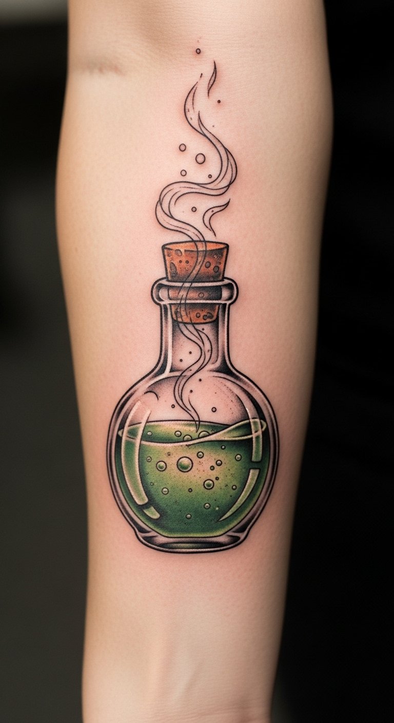 A witchy potion bottle shows bubbling magic inside. It’s a bottle with cork and swirls. Place it on your forearm for utility. Get bottle stickers from fantasy sites for $3. Sketch one with green pens, adding bubbles quick. Old bottles serve as models at home. This saves money. The design brews imagination. Opt for simple lines to lower prices. Personalize potions in sketches. Easy ideas keep it fresh.