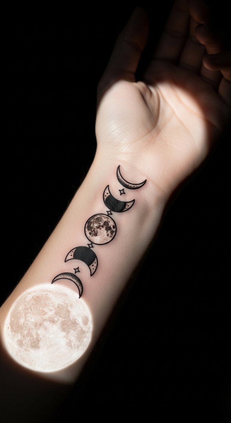 Moon phase garland links crescents in a chain. It’s elegant and spooky. Wear it on your wrist like jewelry. Use phase stickers from astronomy kits for cheap. Draw the chain with silver markers, phasing it out. Cut paper circles for practice. Free and fast. This tattoo orbits style. Go for thin lines to save. Add stars in your art. Apps make editing simple.