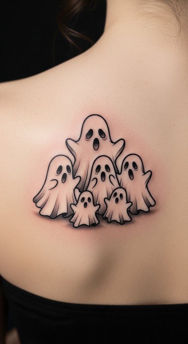 Playful ghost family shows ghosts holding hands. They have fun faces and poses. Put it on your upper back for stories. Find ghost sets in kid’s books for ideas at no cost. Sketch the family with white pencils, grouping them easy. Family photos inspire layouts. This is budget-friendly. The design bonds memories. Choose few ghosts for deals. Customize poses in drawings. Quick sketches help.