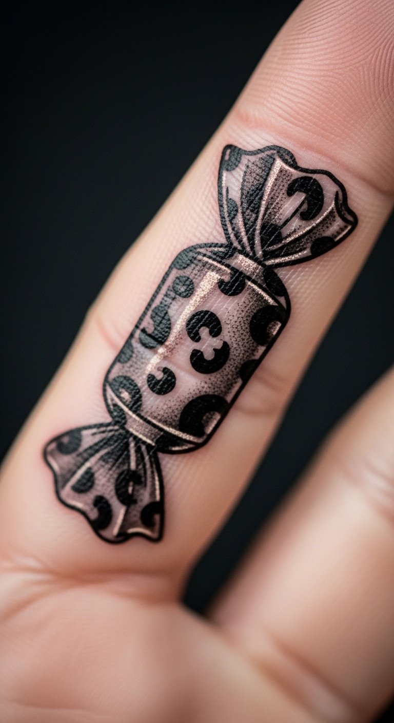 Spooky candy wrapper mimics twisted sweets with ghosts. It’s sweet with a fright. Spot it on your finger for treats. Use wrapper papers from candy for temporary art. Draw one with colored pencils, wrapping the design. Old wrappers serve as stencils. No expense required. This tattoo satisfies cravings. Keep patterns basic for savings. Add your candy type in art. Simple tools do the trick.
