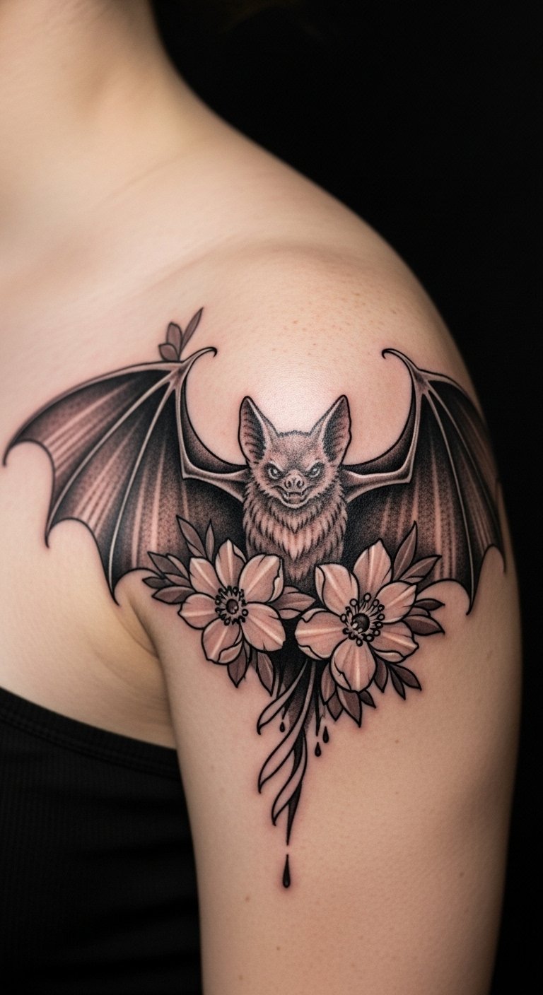 Floral bat wings add flowers to wing tips. It’s a bloom of night. Try it on your shoulder for wings. Get flower-bat stickers from garden stores for $2. Sketch the wings with petal markers, flowering them out. Pressed flowers help for ideas. This is free fun. The design takes flight in style. Opt for outline flowers to cut costs. Personalize blooms in drawings. Apps assist planning.