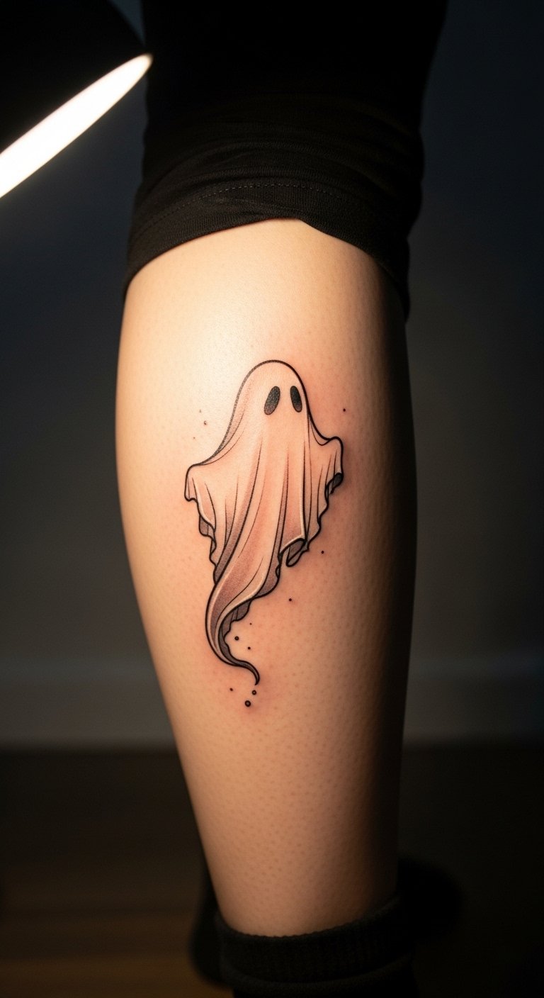Calf placement ghost floats just right on your leg. It’s a simple hover with eyes. Wear it low for activity. Use leg bands with ghost prints for tests under $5. Draw one on your calf with washable ink, placing it perfect. Measure with string for accuracy. No cost needed. This tattoo moves with you. Go for small ghosts to save. Adjust positions in sketches. Easy adjustments work.