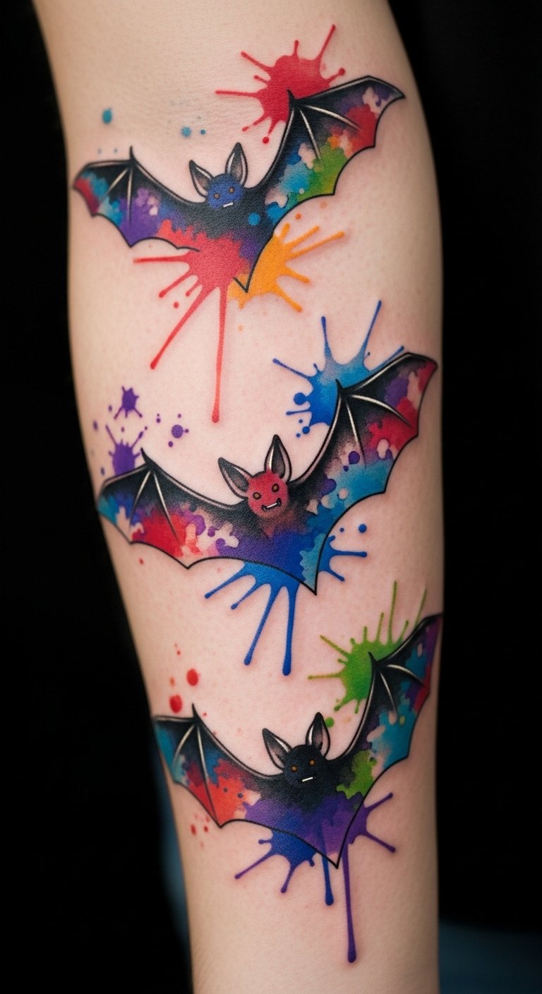 Watercolor splashes with bats create color bursts. Bats fly in the mix. Try it on your arm for art. Use splash paints for temporary effects under $10. Paint bats at home with watercolors, splashing colors. Old brushes work fine. This keeps it cheap. The design paints fun. Opt for few splashes for budgets. Experiment in sketches. Free tools assist.