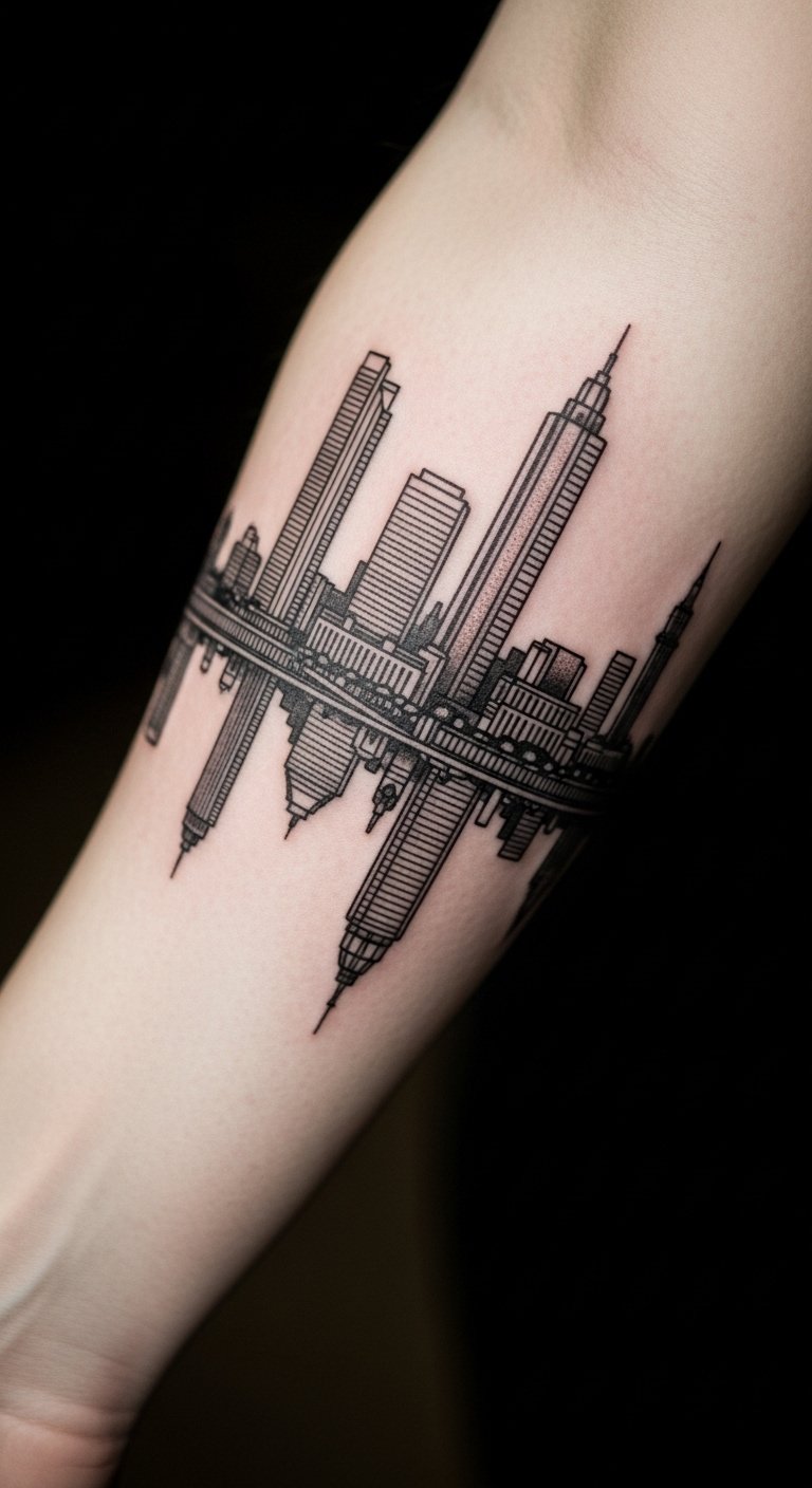 Skylines capture urban spirit. Use simple lines for the buildings. Prices are about $55. Sketch cities on paper beforehand. Position on your arm for pride. Sessions are straightforward. Skyline tattoo fits city lovers’ styles. Apply barrier cream for protection. Link to your hometown. Save by opting for black ink.