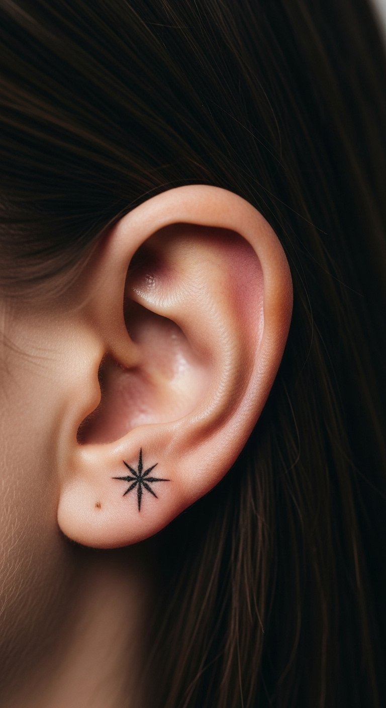 Behind ear spots are discreet. Choose a star. Around $30. Test with temporary marks. Hide or show as needed. Easy placement. Ear tattoo fits various looks. Care for the area. Versatile option.
