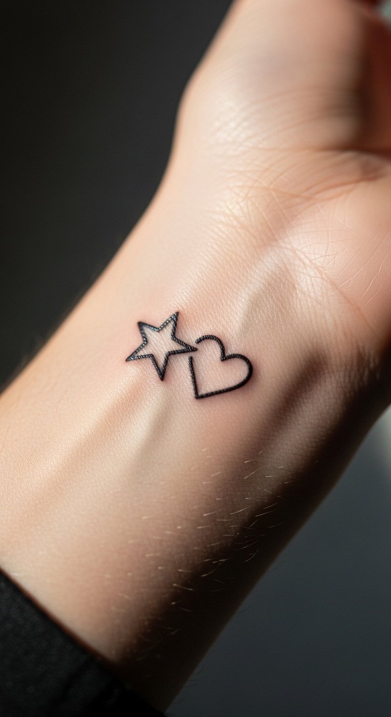 Combos like star and heart mix fun. Blend shapes. About $55. Sketch combos first. Put on your wrist. Balanced design. Combo tattoo enhances style. Protect both elements. Affordable and creative.