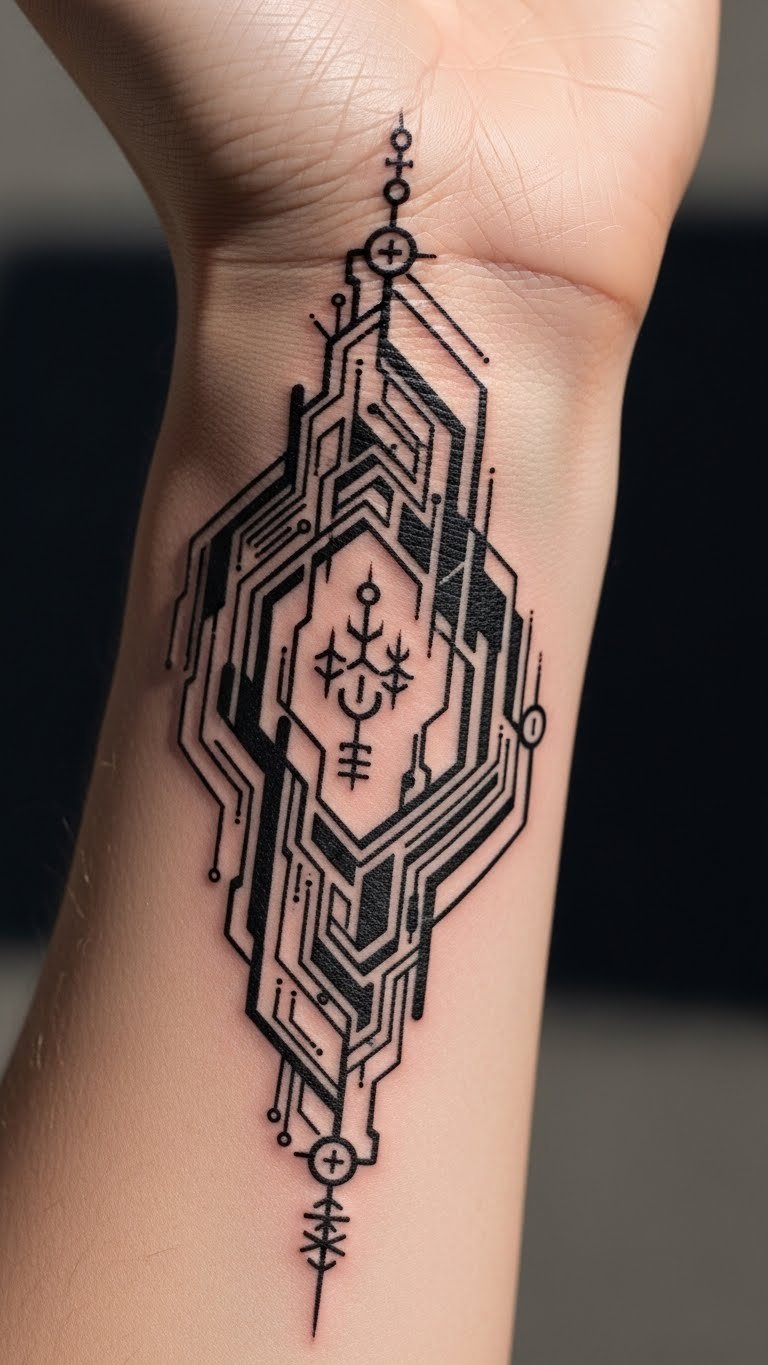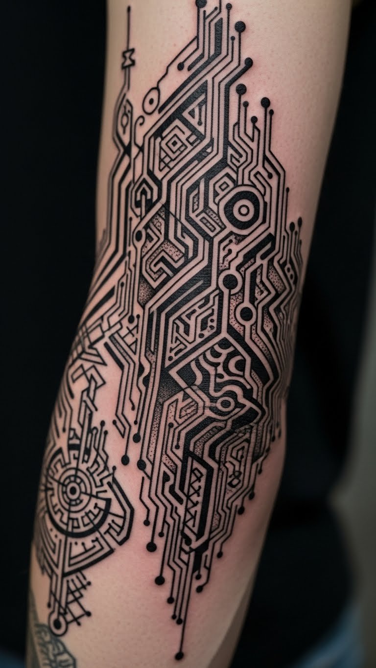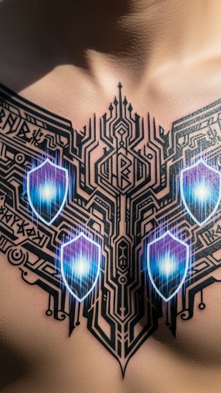 Think of this tattoo as your built-in shield. It uses circuit patterns to represent steady energy. Start small on your arm for less pain and cost.