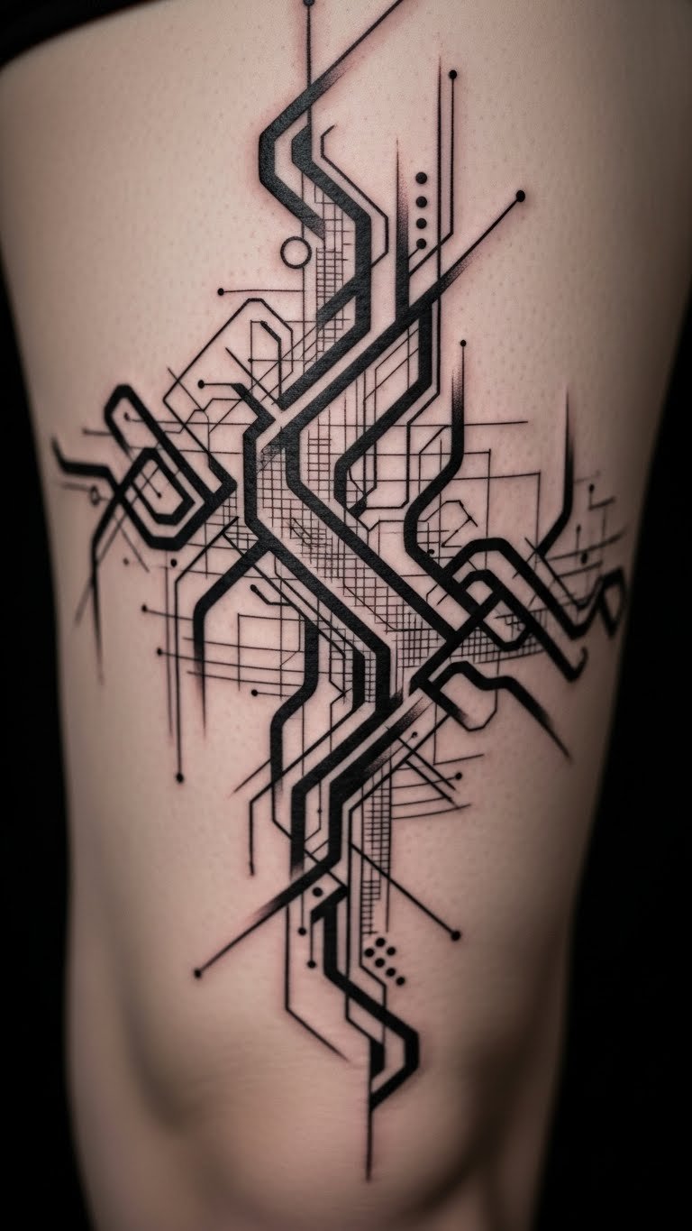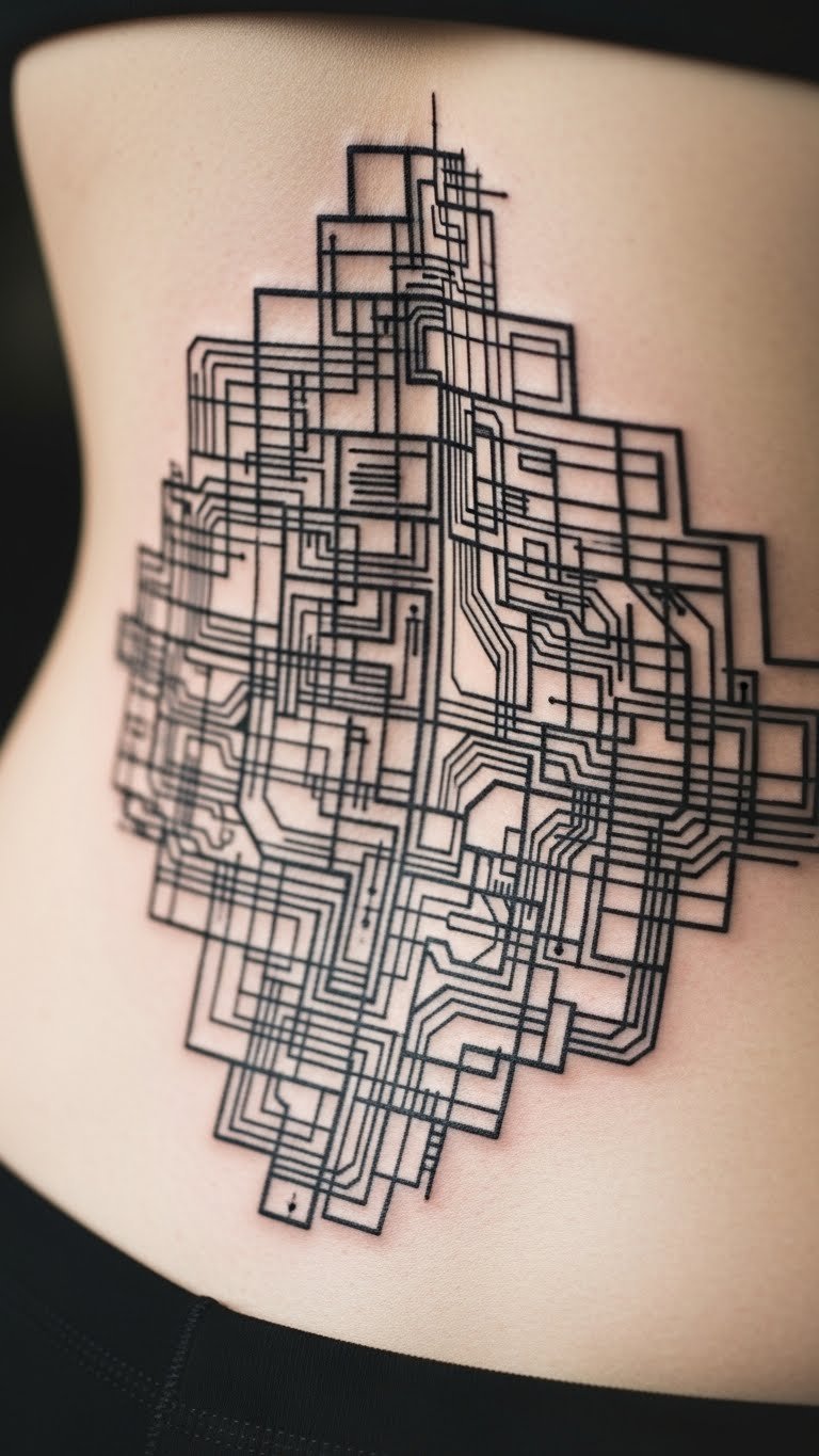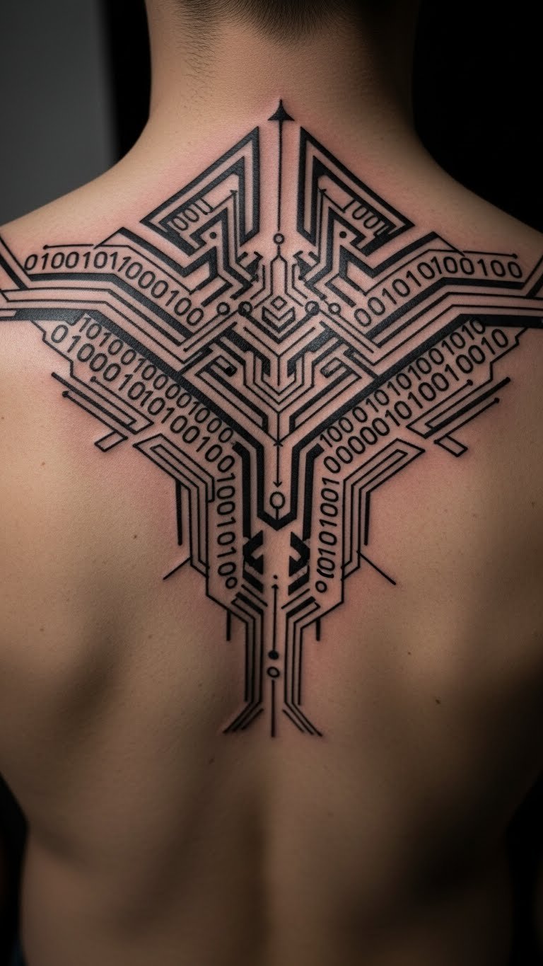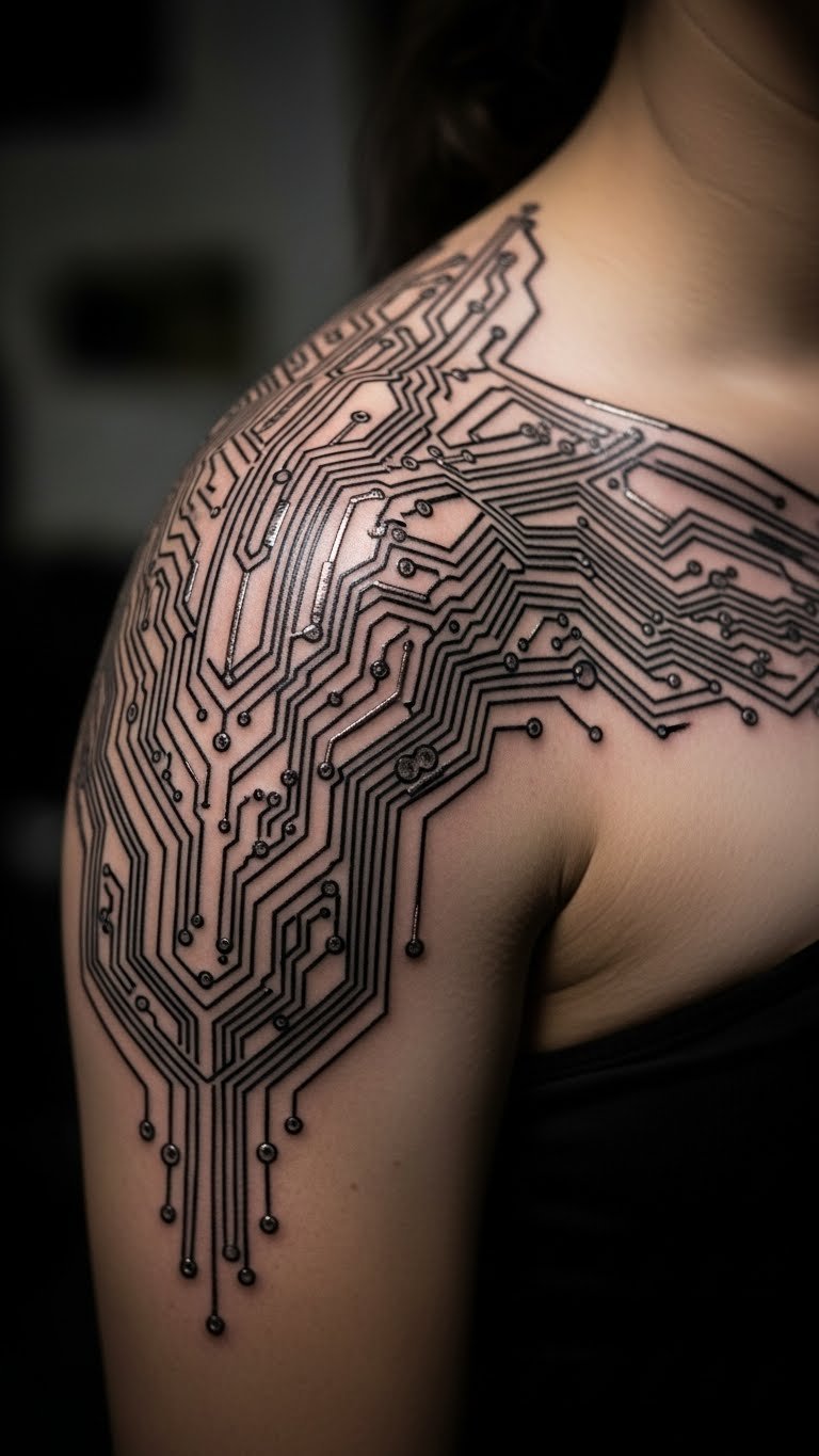 Think of this tattoo as your built-in shield. It uses circuit patterns to represent steady energy. Start small on your arm for less pain and cost.