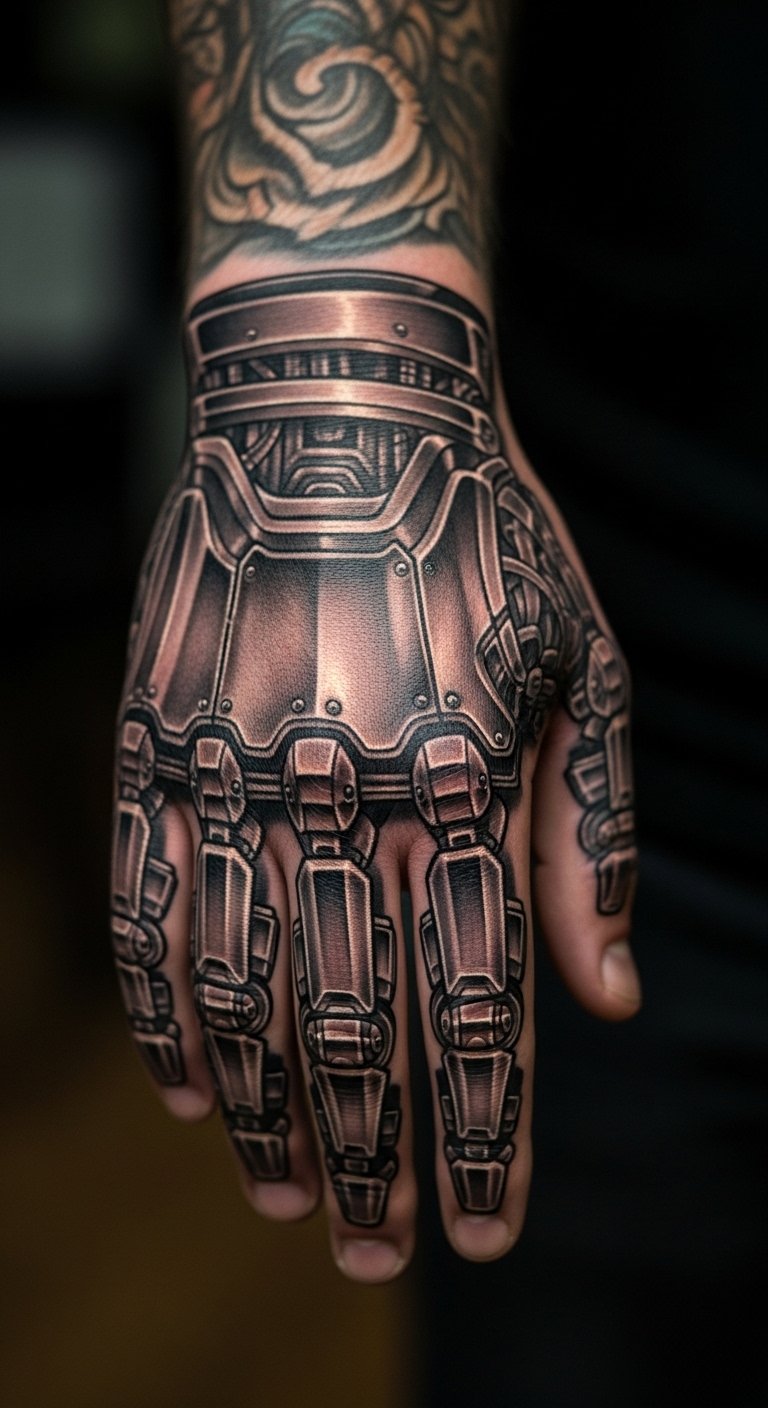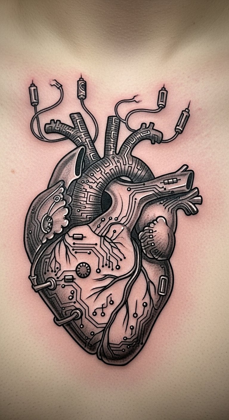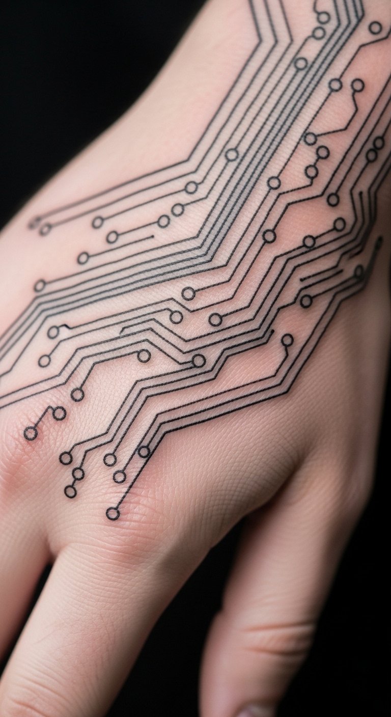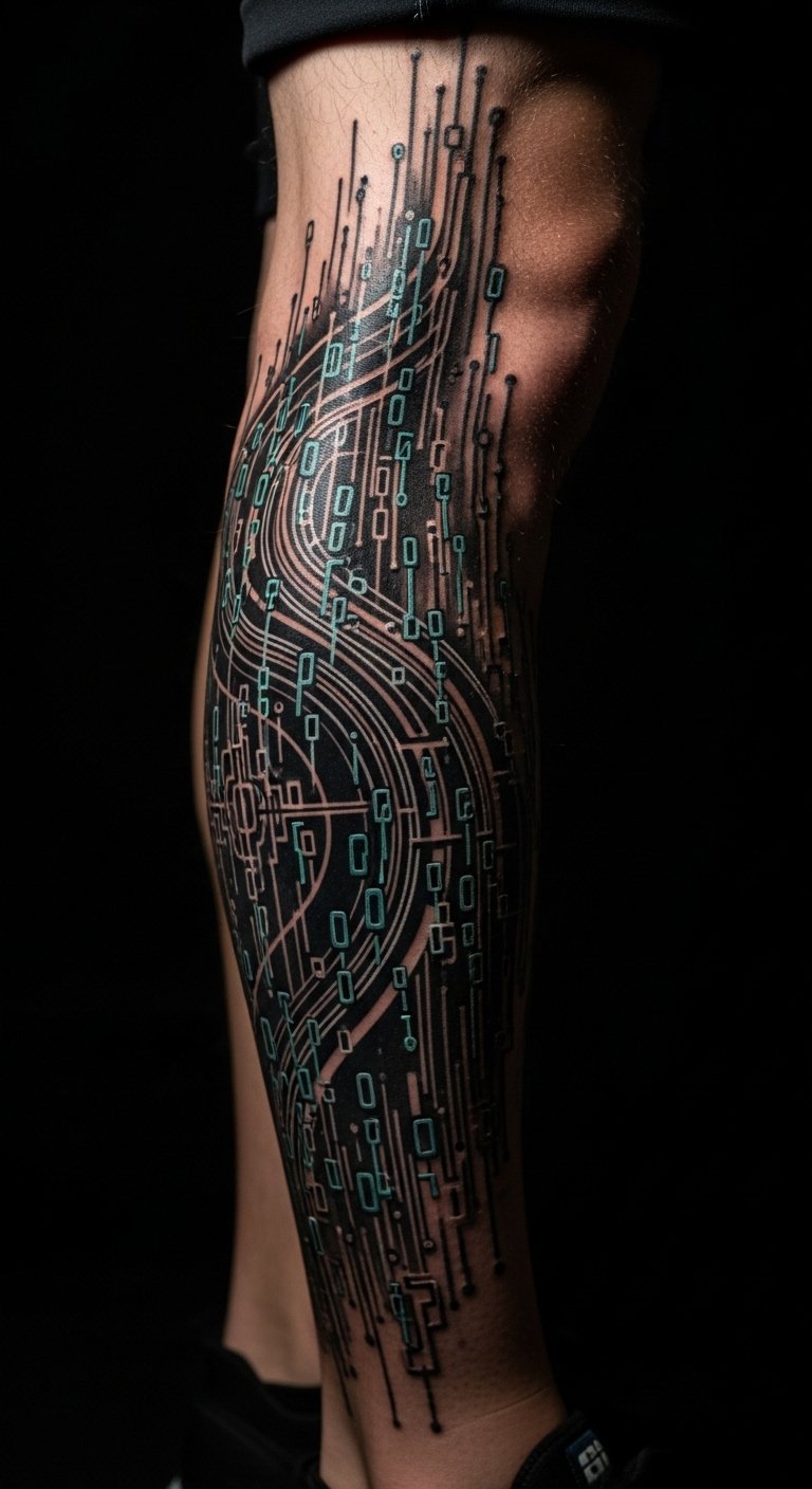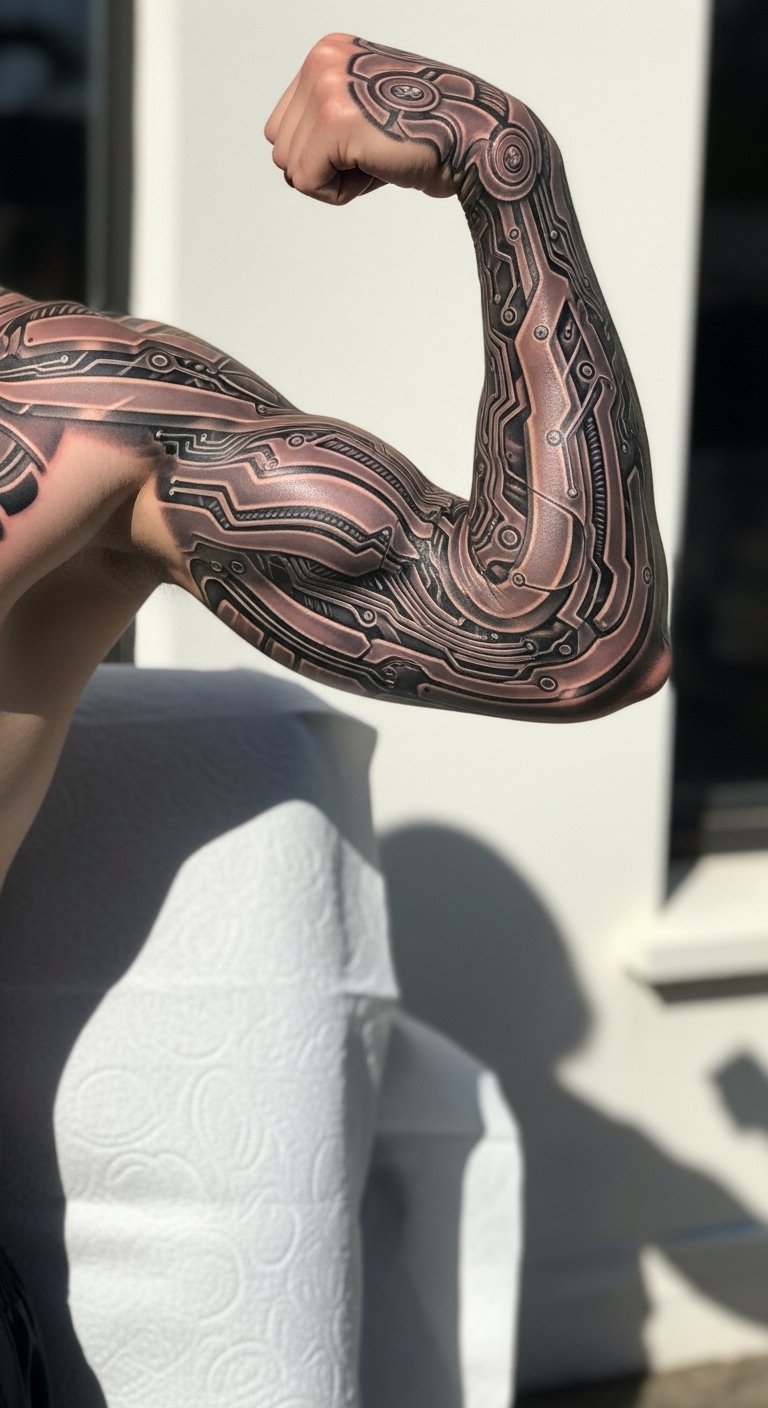 Picture a sleeve where circuits flow like veins down your arm. This tattoo blends metal and flesh for a high-tech edge. Start simple: sketch ideas on paper using free apps like Procreate on your phone. For budget tips, visit local tattoo expos for deals under $100. Break it down—get one section at a time to save cash. If you’re artistic, draw your own blueprint at home with markers. Real DIY example: Trace circuit patterns from online images and adapt them to your arm shape. Keep sessions short to manage discomfort. This design flows with your body, making it easy to wear daily. Add personal twists, like incorporating a favorite symbol. Go for black and gray ink first to test the look. It’s all about making tech feel real and yours.