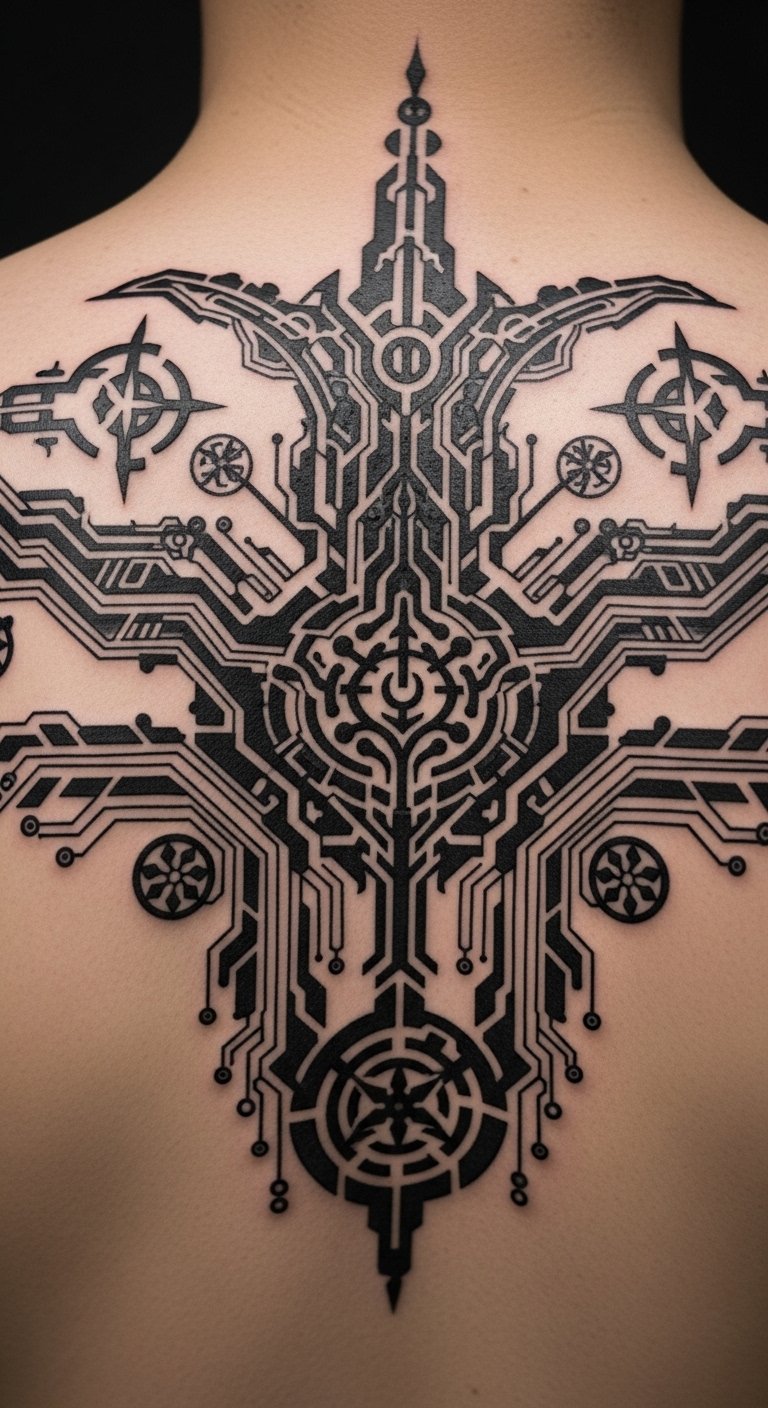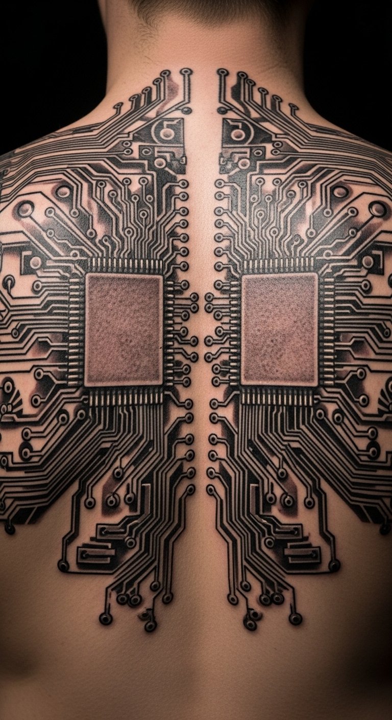 Imagine your back as a living circuit board, full of wired paths and components. This piece turns your skin into a tech map. Draw rough drafts on your body with washable pens for a quick preview. Save money by consulting apprentices at studios—they often charge less. Build it in phases, starting with a small section for around $50. DIY at home: Use graph paper to plot circuits based on real electronics photos. Keep lines clean and simple for easier application. This tattoo fits any outfit, hidden or shown. Experiment with placement using phone filters. Focus on what matters—your story in the design. Make it personal by adding custom elements like dates.