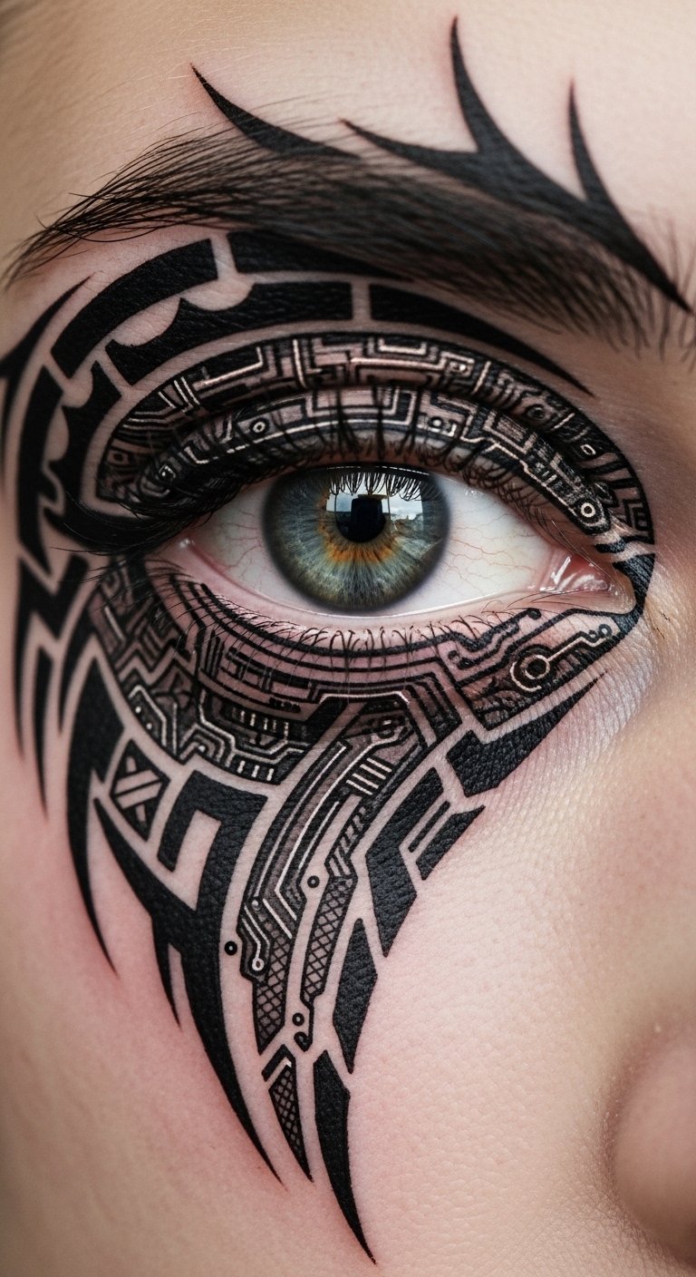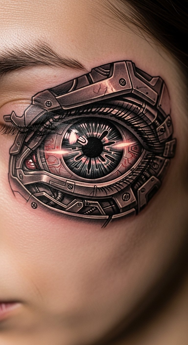 See a robotic eye staring back from your face or neck. This small design packs big impact with mechanical details. Practice by drawing eyes on paper or your mirror with eyeliner. Find affordable artists online through community forums. Start with a mini version for under $80. DIY idea: Snap a photo of your eye and edit in circuits using free software like GIMP. Keep the size small for less pain and cost. Wear it as a conversation starter under hats or hair. Adapt the style to match your features for a natural flow. Think about daily life—place it where it’s easy to cover. This tweak makes you feel futuristic without overdoing it.