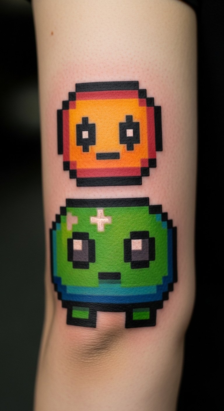 Add pixel blocks to your elbow for a game-like feel. Use pixel editors on your phone to plan. Get it cheap from new artists, around $40. DIY: Build it pixel by pixel on paper first. Keep it fun and small. Hide or show based on your day.