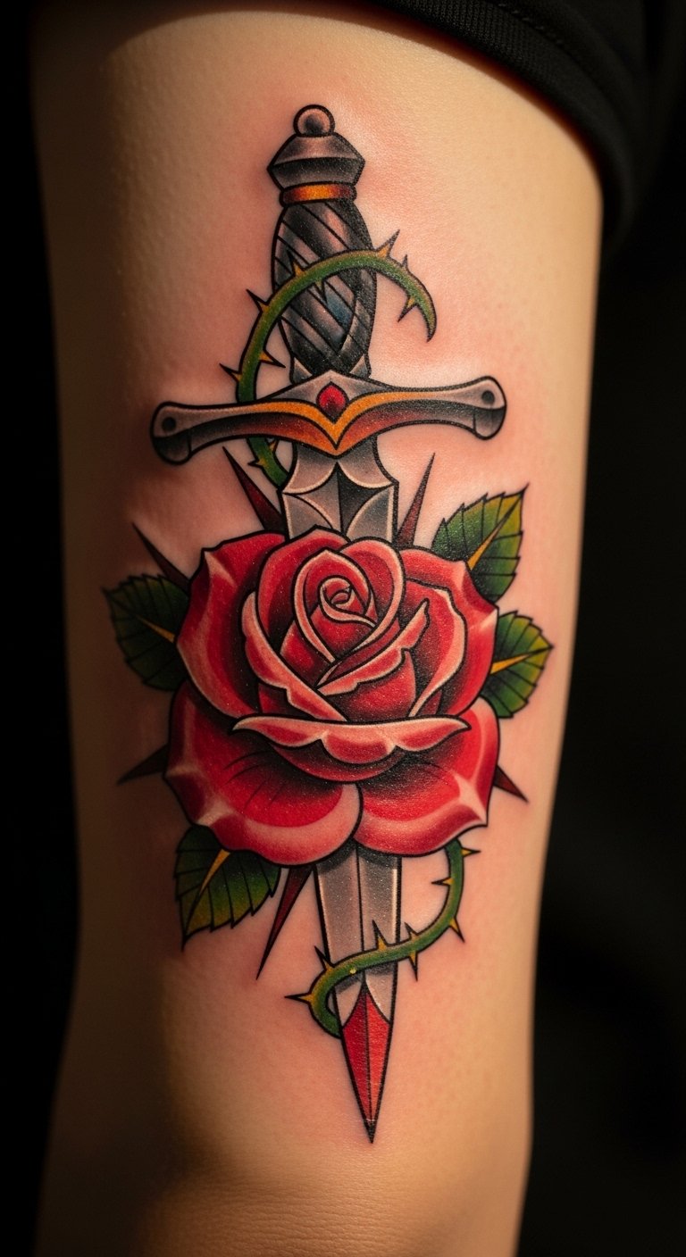 Classic Rose and Dagger Tattoo