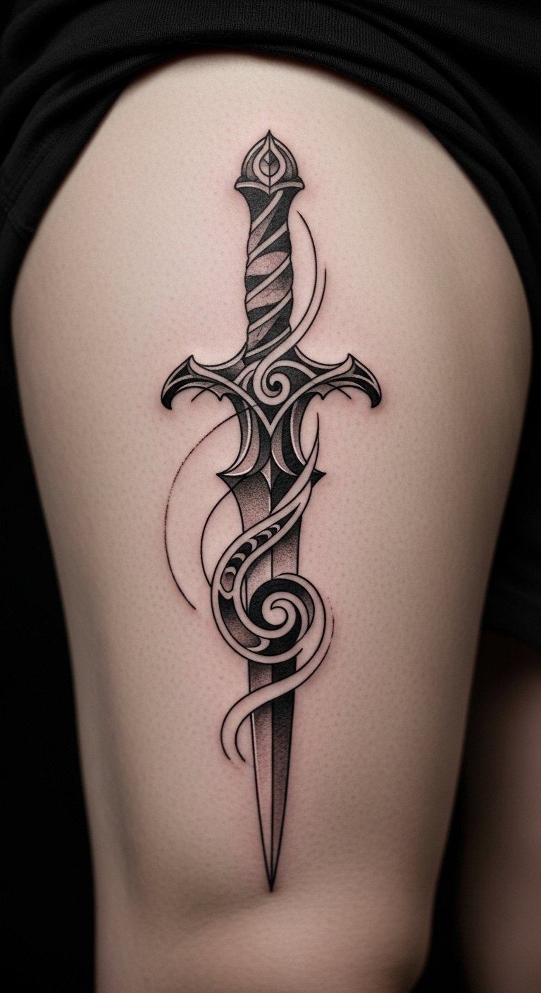 An abstract dagger tattoo plays with shapes, offering a creative spin on the classic. It’s artistic and unique. Experiment with forms on paper. Budget tip: Free art apps assist. Abstract dagger sparks imagination. Mock up with shapes. Place on thighs for space. This tattoo innovates and expresses.