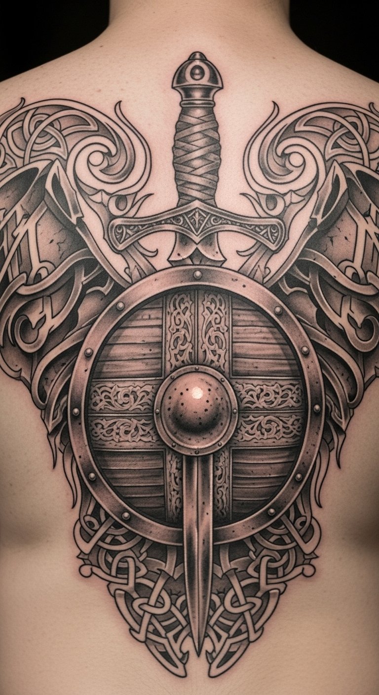 A dagger and shield tattoo means defense and bravery, a perfect pair for protection. It’s balanced and strong. Combine symbols in sketches. Online resources are free. Dagger and shield stands for safety. Use temporary pairs. Put on back for symmetry. This tattoo fortifies resolve.