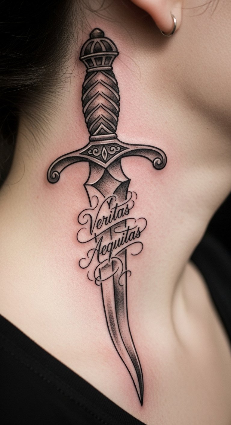 A custom inscription dagger tattoo adds words for a personal message, making it truly yours. It’s meaningful and direct. Write phrases on drafts. Free fonts online help. Custom inscription dagger personalizes deeply. Practice with word stickers. Place on neck for impact. This tattoo conveys stories.