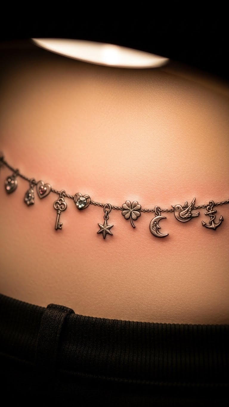 Charm tattoos inspire. Inspired on your lower back. Use charm shapes. Search for budget options. Inspired in drawings. This keeps it personal. Collect over time. Heal with ease. Charms add playfulness.
