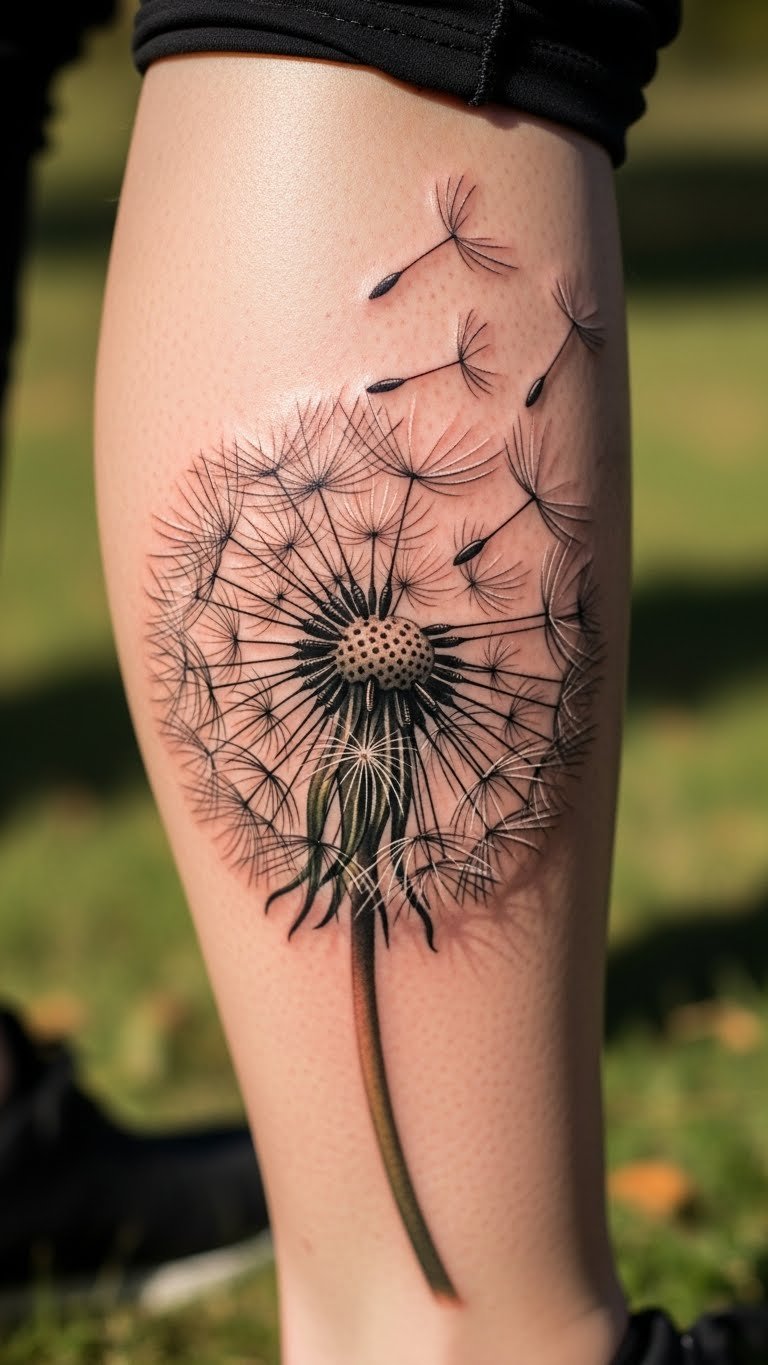 Fades create soft endings. This dandelion blends into skin. It represents letting go gently. Forearm areas show progress. Look for fade techniques cheaply. Some artists specialize. Draw fades on paper. Feel the shift. This design means release with ease. Use light gradients to save money. Add soft lines. Many choose this for closures. Adjust for sleeves. Real example: practice with blurs. It’s soft and affordable.