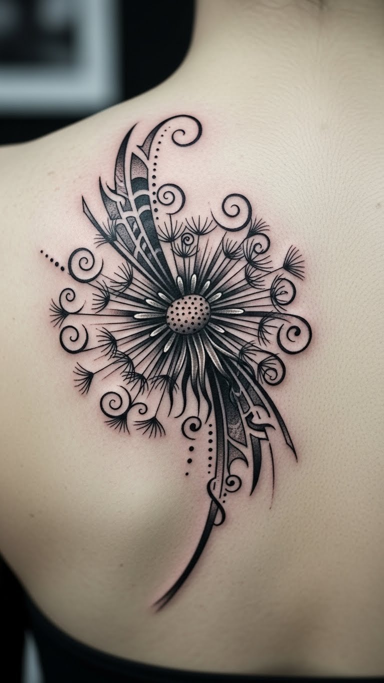 Spirals add journey paths. This dandelion twists and turns. It represents life’s twists. Back areas tell big stories. Search for spiral artists affordably. Some offer flows. Draw spirals on sketches. Feel the path. This design means growth in circles. Keep spirals tight to save. Add seeds for movement. People ink this for adventures. Show it on trips. Real idea: use curve guides. It’s journey-focused and budget.