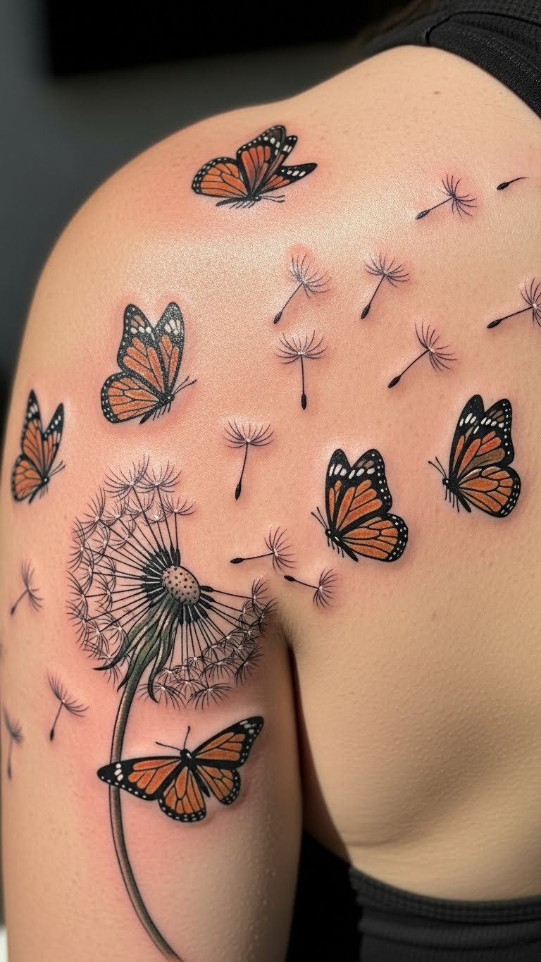 Butterflies with dandelions show change. This combo highlights renewal. It means second chances vividly. Put it on your shoulder. Look for combo deals online. They help with costs. Draw butterflies on sketches. See how they fit. This tattoo represents healing journeys. Keep elements few to save money. Add wings for flair. Many get this after transitions. Wear tops that show it. Real example: plan with free software. It’s a thoughtful, budget pick.
