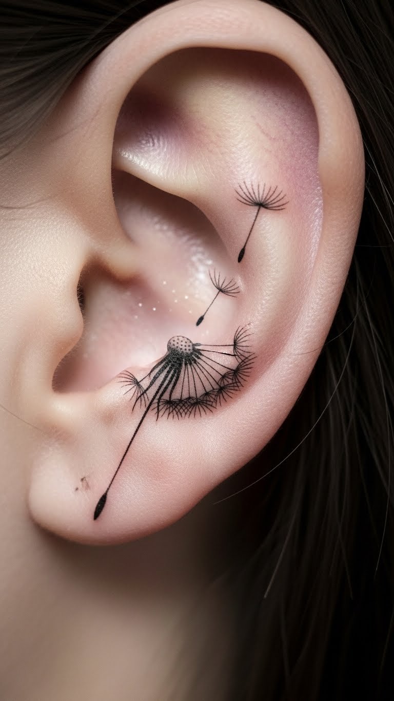 One seed makes a statement. This dandelion focuses on a single element. It symbolizes dreams taking flight. Ear placements keep it discreet. Find ear specialists cheaply. They do quick work. Practice with dot drawings. Build your wish. This design means aspirations simply. Go tiny to stay affordable. Add a curve for wind. Folks choose this for goals. Hide it with hair. Real tip: use mirrors to visualize. It’s easy and personal.