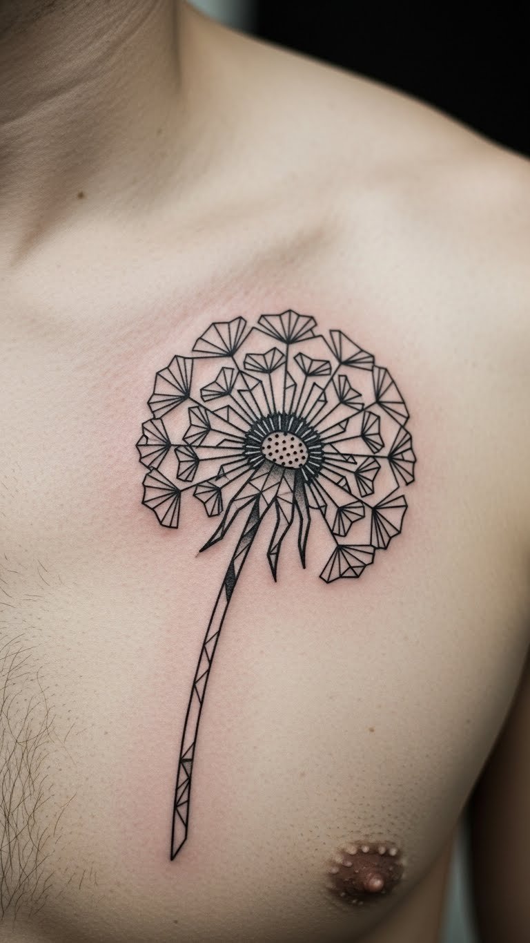 Geometric dandelions add edge. This version uses shapes and lines. It shows personal growth boldly. Chest placements feel bold. Search for geometric pros affordably. Some have sales. Draw shapes on paper. Experiment freely. This design means transformation sharply. Opt for basic geometries to save. Add angles for interest. People choose this for journeys. Cover with shirts. Real idea: use grid paper to plan. It’s stylish and budget-friendly.