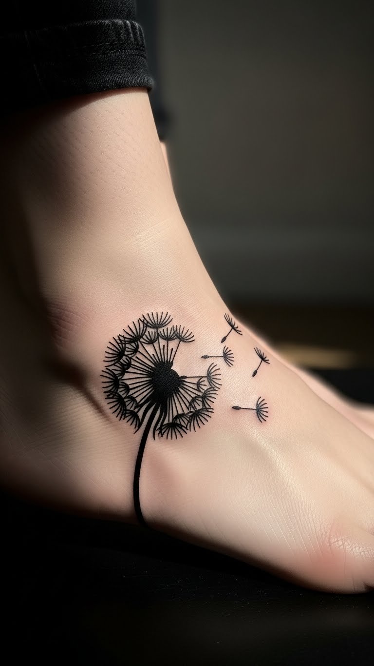 Silhouettes create mystery. This dandelion uses dark fills. It represents hidden strength. Foot spots keep it grounded. Look for silhouette deals. They are often cheap. Trace silhouettes at home. See the shadow. This tattoo means resilience quietly. Go for solid blacks to cut costs. Add subtle curves. Many ink this for inner power. Hide with shoes. Real example: practice with shadows. It’s mysterious and affordable.