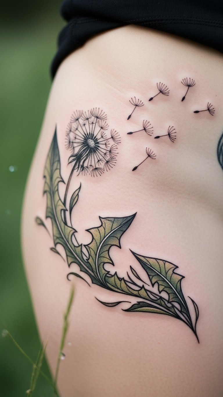 Leaves with dandelions show progress. This design adds green touches. It stands for nature and change. Hip areas feel personal. Find leaf artists at low prices. Check local options. Draw leaves on sketches. Make it grow. This tattoo means renewal with extras. Use few leaves to save money. Add veins for realism. Folks get this for transitions. Adjust for outfits. Real tip: use plant references. It’s growing and cheap.