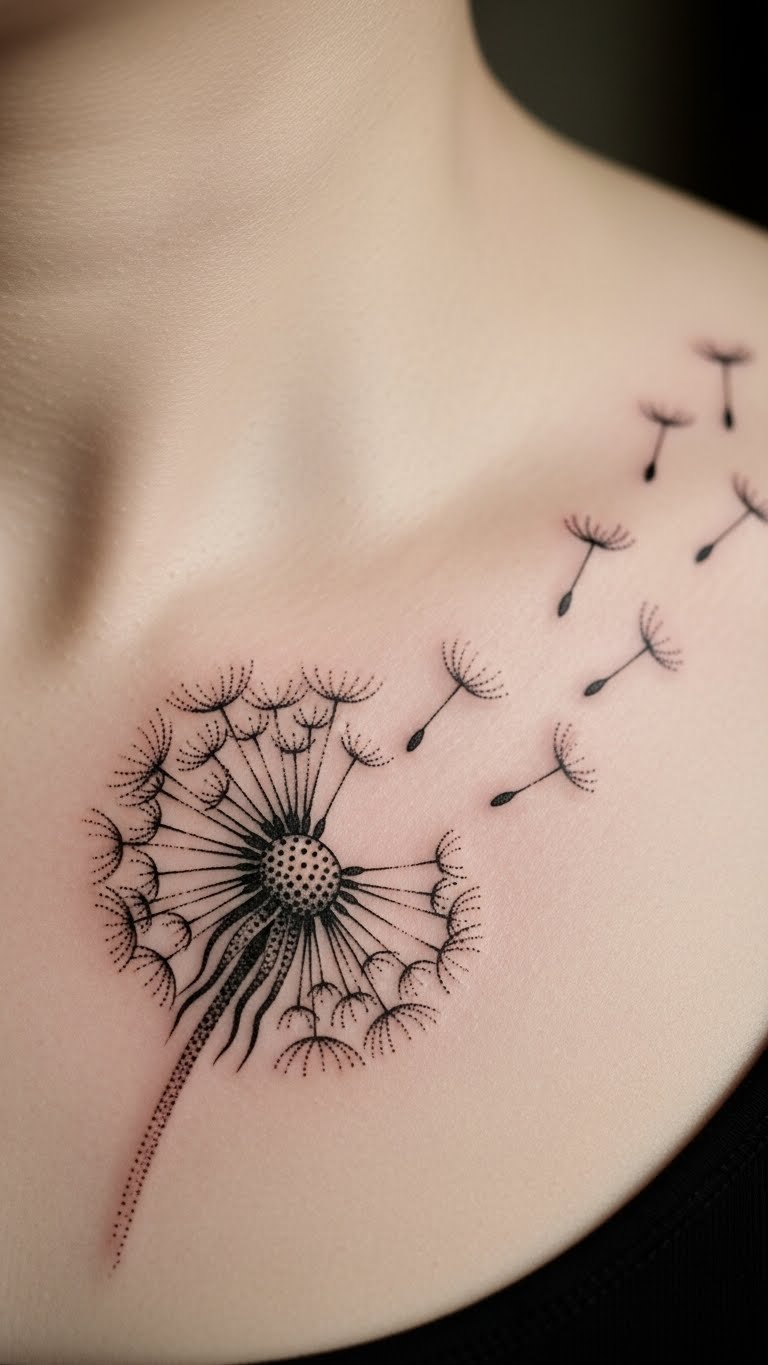 Dotwork adds texture. This dandelion uses dots for depth. It represents detailed strength. Collarbone spots are elegant. Find dotwork artists on a budget. Some do it fast. Practice dots with pens. Build patterns. This design means perseverance through points. Go for sparse dots to save. Add shading effects. Folks ink this for challenges. Cover with collars. Real tip: use dot templates. It’s detailed and cheap.