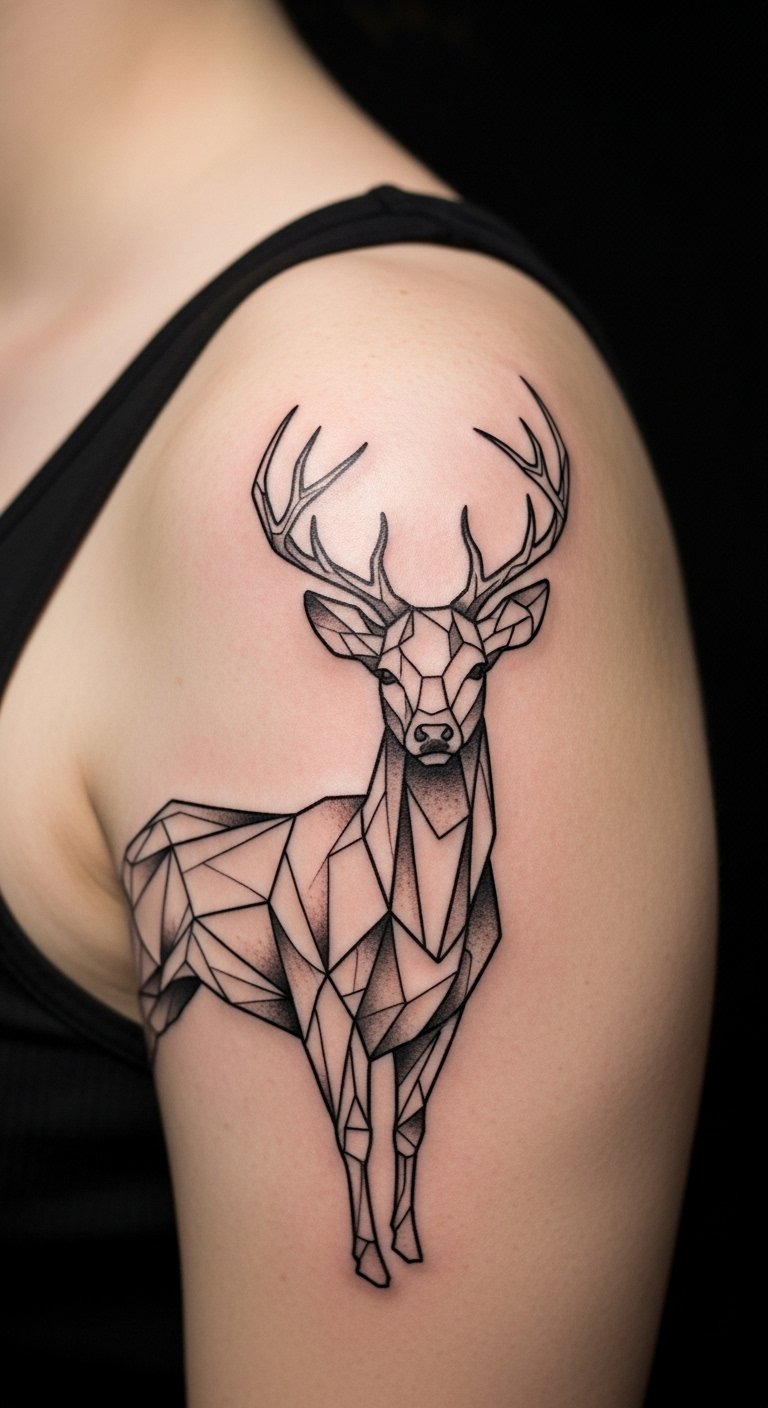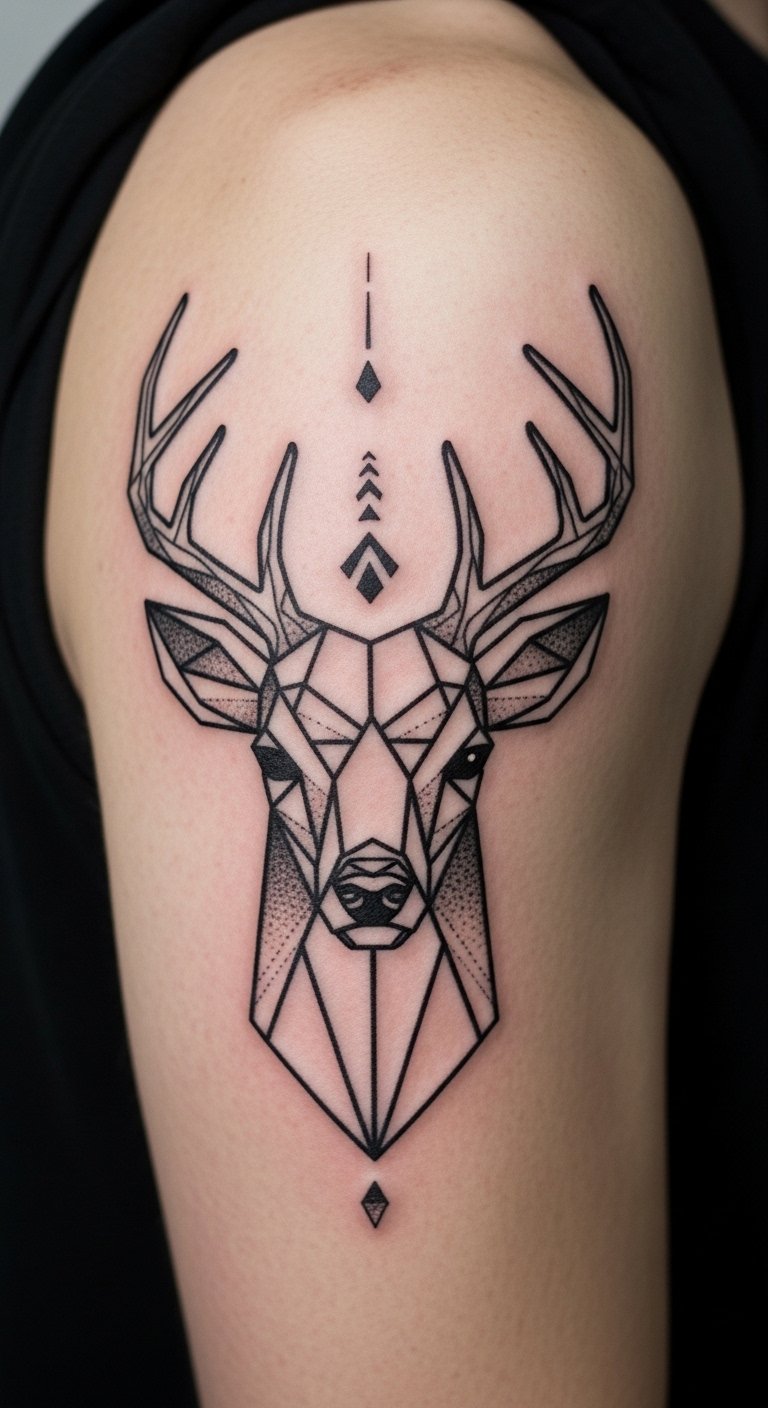 Sharp angles turn a deer head into a modern piece. Think triangles and squares forming the antlers. It mixes art with nature’s power. Grab graph paper and a ruler to sketch ideas yourself. It takes minutes and saves money. Online sites offer free templates to print. Stick one on with tape to test spots. Put it on your shoulder for a bold feel. Find an artist through social media groups. Many charge by the hour at affordable rates. Aim for sessions under $150. This design heals fast with basic lotion from your drawer.