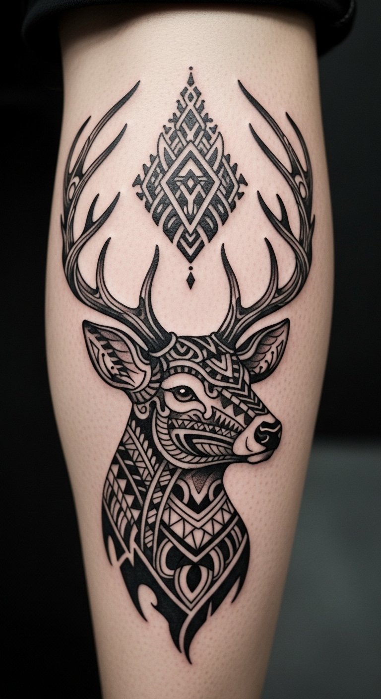 Bold patterns wrap around a deer like ancient stories. The antlers show strength through thick lines. Draw inspiration from old tribal art using a free app on your phone. Trace shapes on your skin with a marker first. It helps see how it flows. Place it on your leg for easy cover. Search local shops for artists who do ethnic styles. They might offer first-timer discounts. Keep the bill around $200 with simple colors. Use aloe vera from home to soothe the area after.