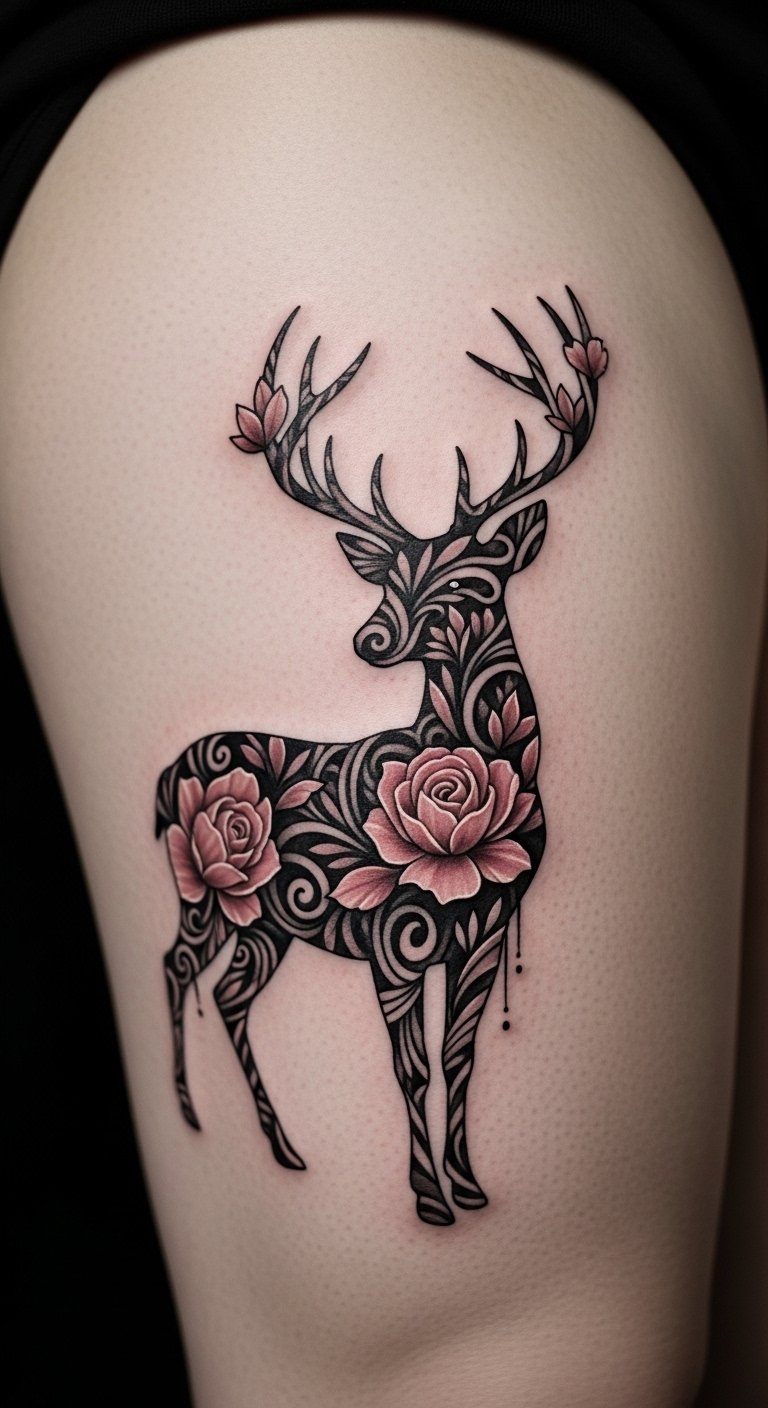 Swirls and petals blend into a deer shape. It creates a dreamy, nature-fused look. Use colored pencils at home to mix your flowers. Free software lets you edit designs quickly. Hold a mirror to see how it sits on your thigh. Pick an artist from online reviews for fair prices. Basic work might cost $150. Protect it with a clean bandage from your kit.