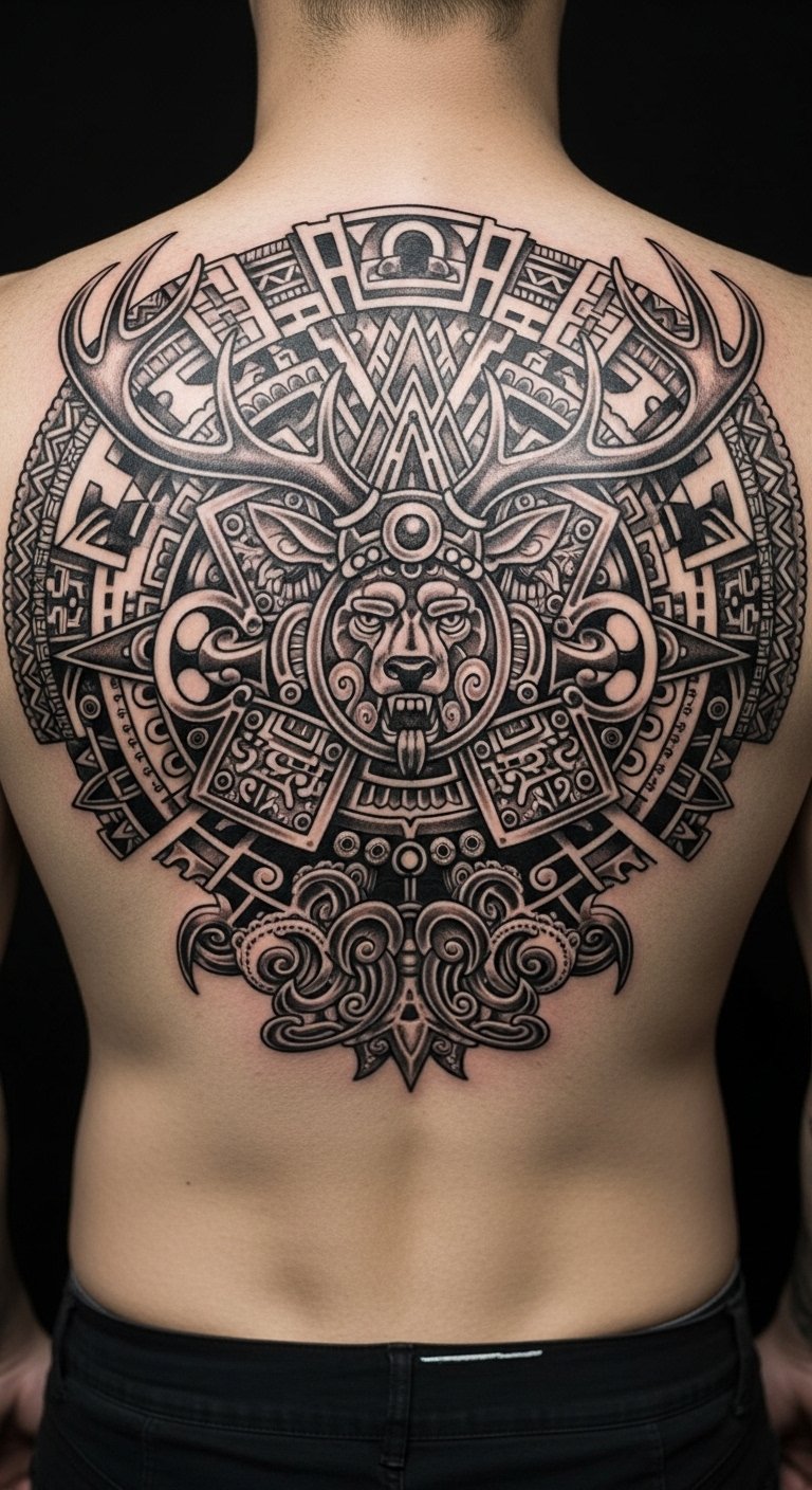 Warrior marks surround a fierce deer. It draws from ancient fights and spirit. Draw basic shields with markers yourself. Online resources provide free Aztec patterns. Use a phone app to overlay on your skin. Position it on your back for strength display. Contact local ink spots for budget sessions. Expect $250 for detailed pieces. Tend to it with daily creams you own.