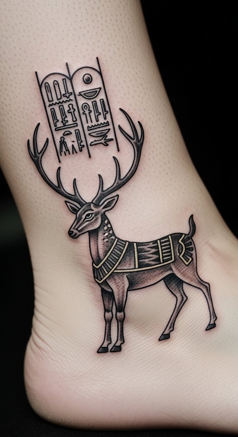 Hieroglyphs frame a mystical deer. It echoes desert legends of guidance. Trace symbols on paper with a pen. Free apps offer Egyptian styles to adapt. Test with stick-on versions at home. Ankles keep it subtle yet present. Search for artists via apps with price filters. Jobs like this run about $90. Protect with soft fabrics during healing.