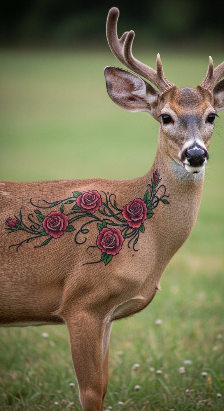 Roses climb around a gentle deer. It speaks of beauty and growth together. Draw vines on paper to plan your mix. Free drawing programs help add petals. Apply a temporary stamp to your rib first. Ribs offer a hidden, personal touch. Get quotes from nearby parlors online. Costs stay under $200. Use home remedies like honey for care.
