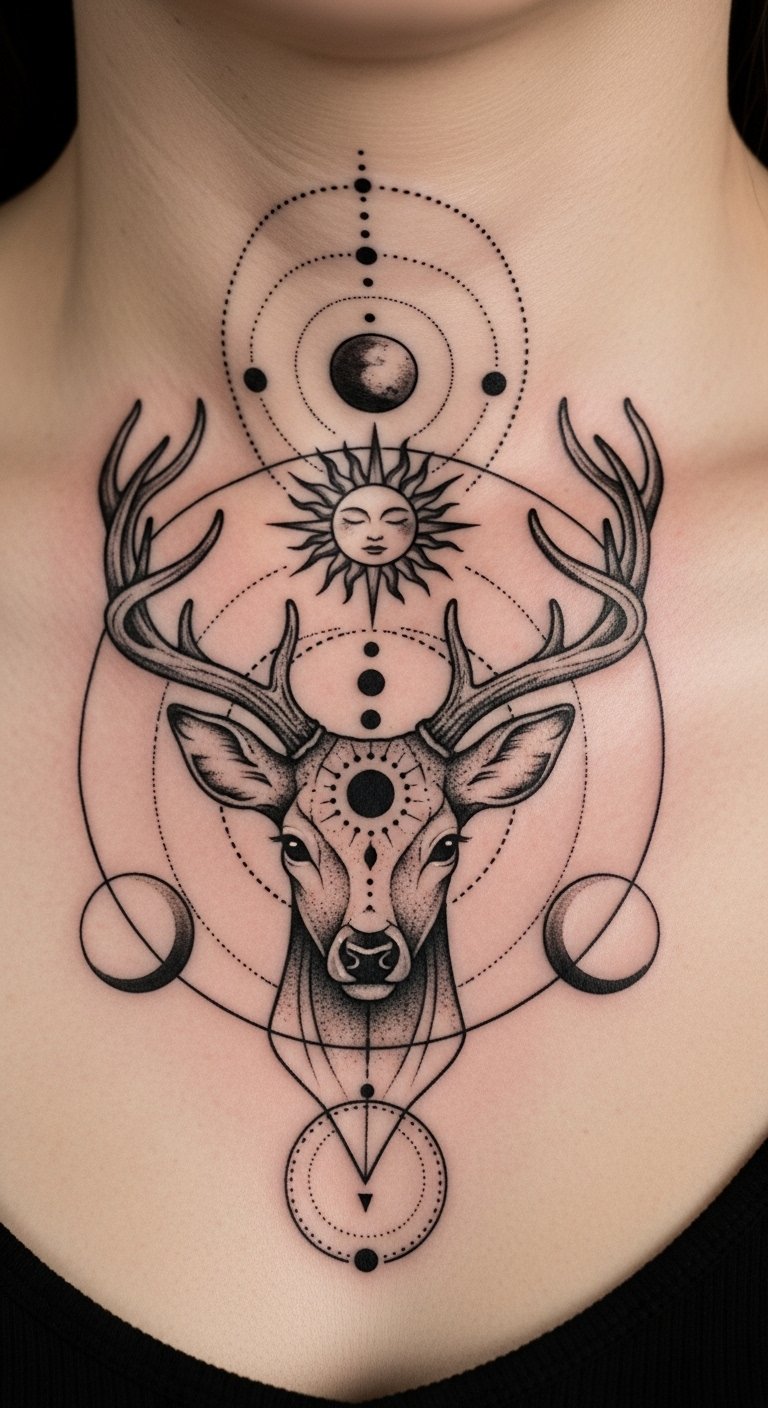 Sun circles and moon crescents hug a deer. It shows balance in simple forms. Sketch celestial shapes with a compass at home. Online tools provide free fusion ideas. Hold a template against your collarbone to fit. Collarbones frame it nicely. Ask artists for hourly rates to save. Around $130 works. Keep it clean with basic supplies.